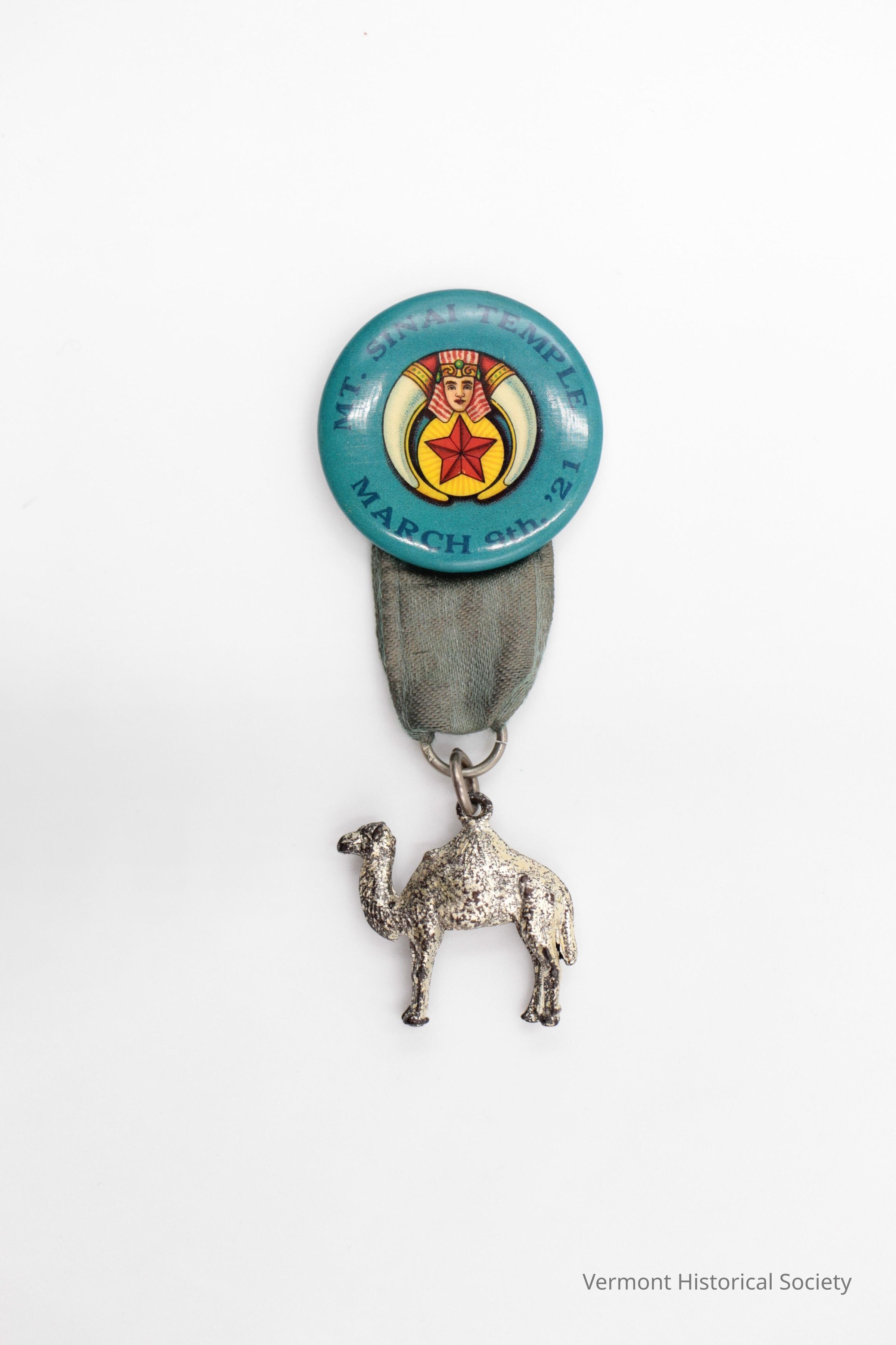 Membership pin consisting of a button, ribbon, and pendant. The round metal button is printed with an image of the Shriners logo (a head at the center of two curved horns surrounding a 5-pointed star) and the inscription, "MT. SINAI TEMPLE MARCH 9TH '21". A blue satin-wove ribbon (floats now mostly disintegrated) hangs from the button with an eye ring looped at the bottom. From the eye ring hangs a metal pendant shaped like a camel.