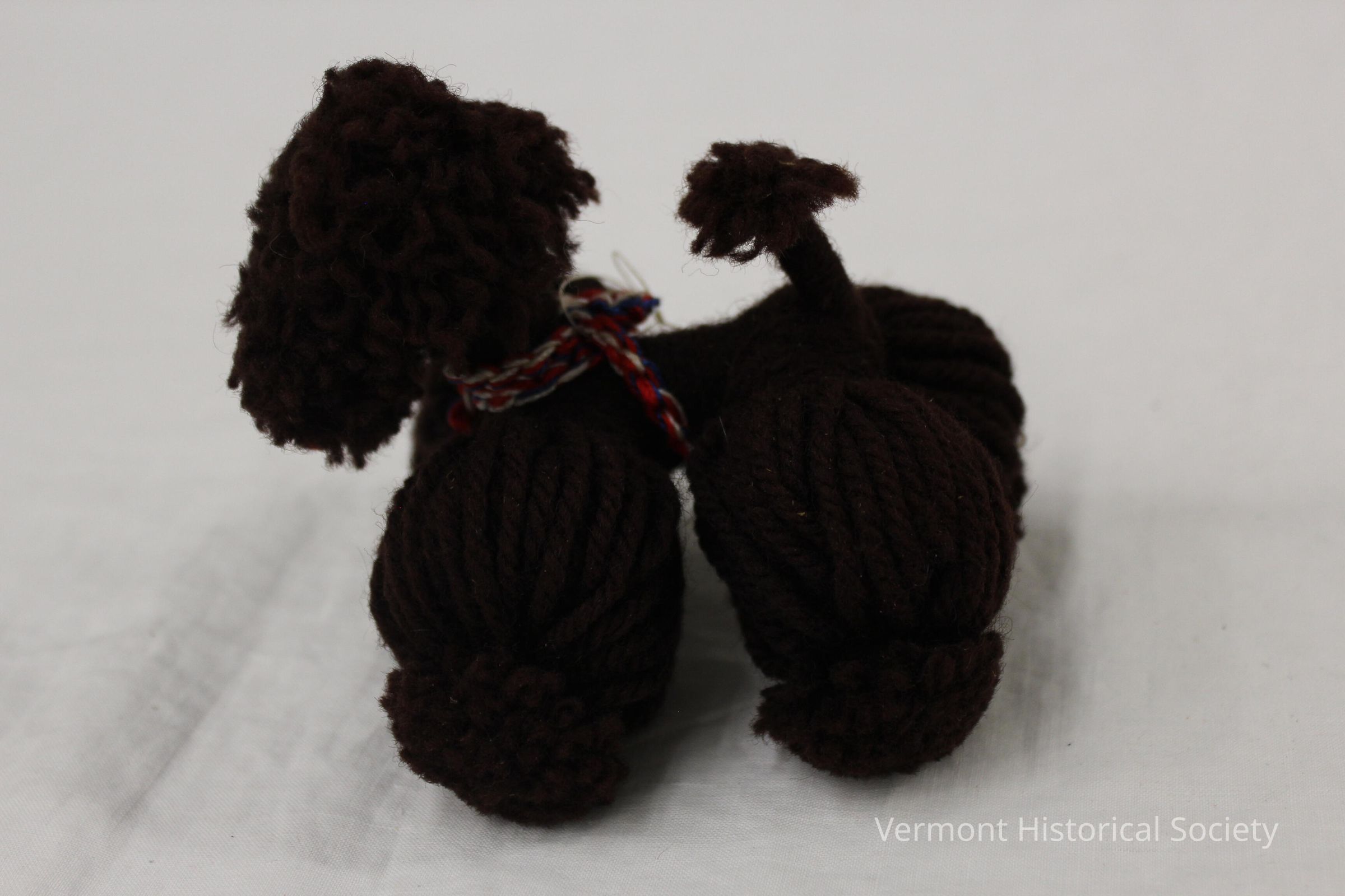 A brown yarn French poodle with a red, white and blue leash and a red tongue.It came in a plastic sylinder with a red, white and blue ribbon handle and a note says it is from the Hotel Carlton in Lyon.Context