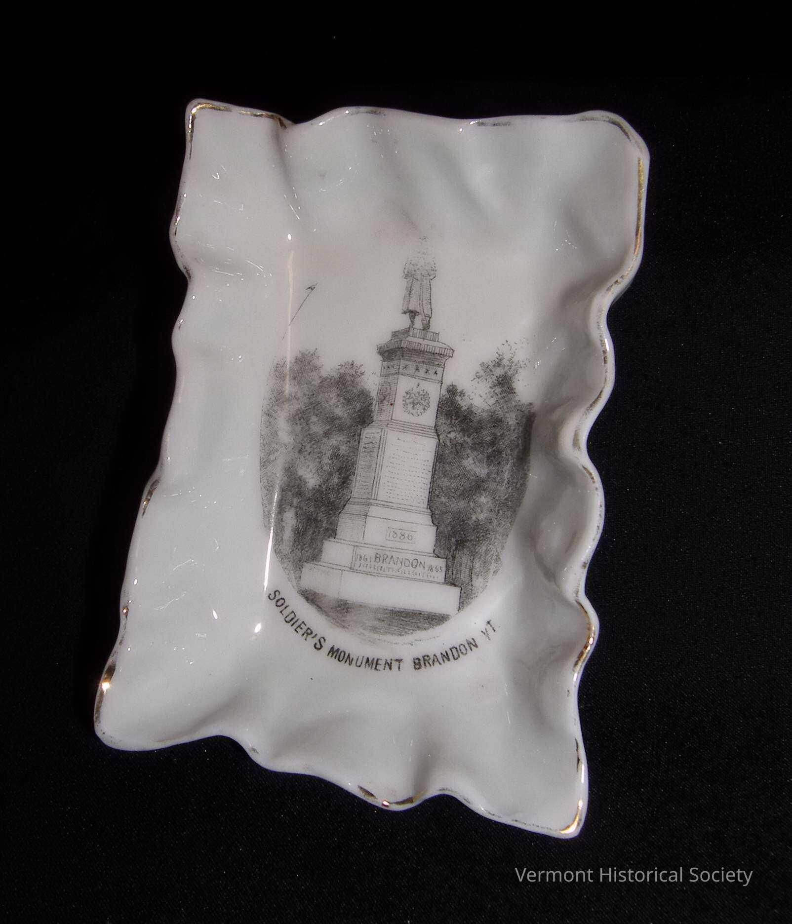 Rectangular card receiving tray. The edges of the tray are molded into curves to appear "wrinkly" and gilded along the very edge. The center is printed with an engraved illustration of a tall monument topped with a man. The image is labeled, "SOLDIER'S MONUMENT BRANDON VT." The bottom is marked, "MADE IN GERMANY FOR F. W. BACON BRANDON VT."