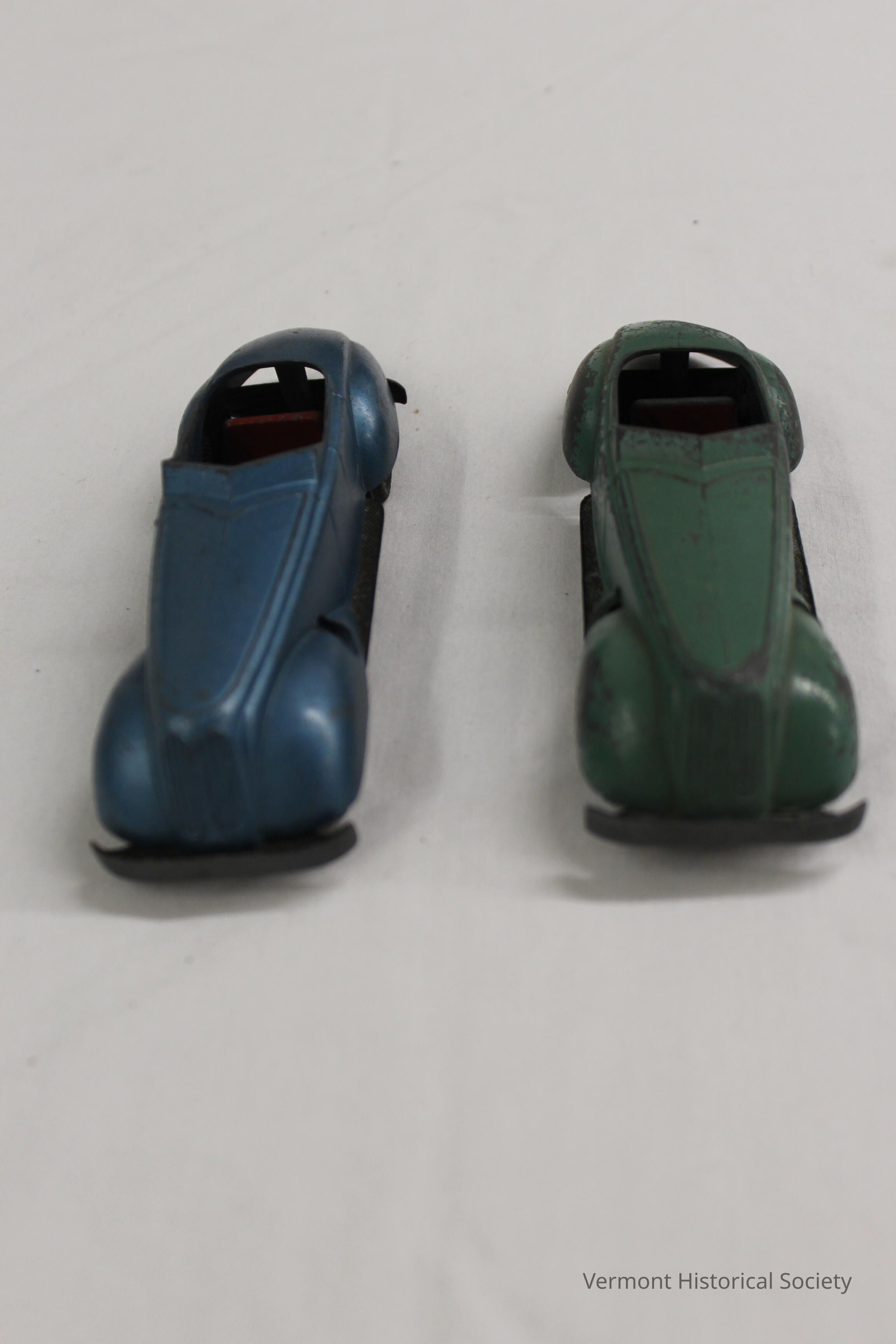 Two metal convertible roadsters, each with two rows of red seats. Car a is green and car b is blue.Context