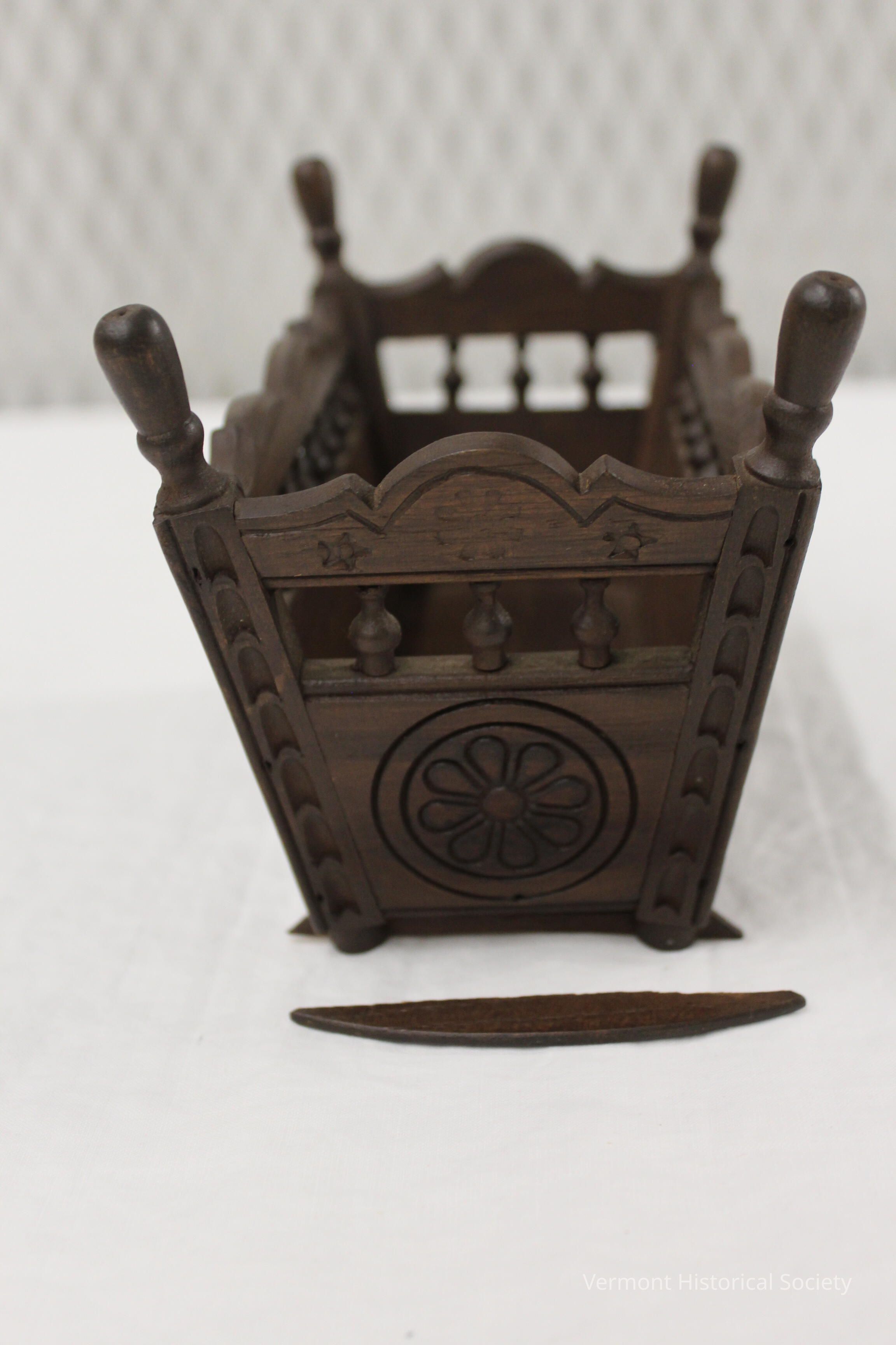 Miniature wooden cradle with one rocker broken off. It has a dark finish, spindle and scalloped top and carved flowers on the sides and ends.Context