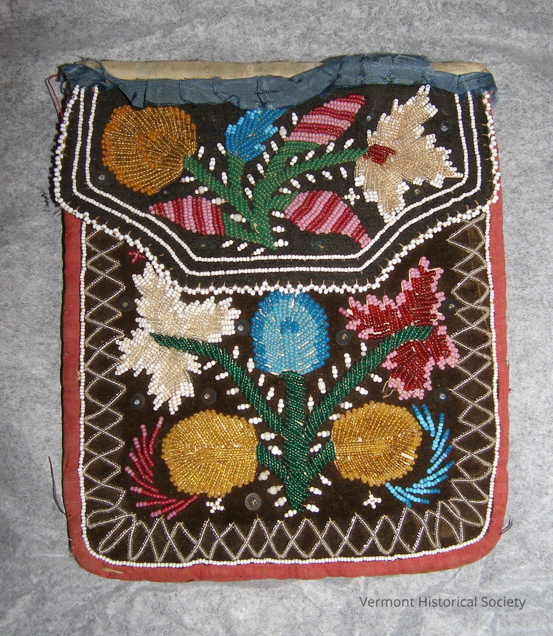 Large beaded bag. The bag opens at the center top, and the opening edge is bound with white leather. The front has a decorative upper flap. The front flap and front side are decorated in a floral pattern made from glass seed beads in red, pink, orange, yellow, white, clear, blue, and green. The beaded design is stitched on paper, then appliqued to the backing fabric, a black velvet. The edges are decorated with white and clear glass beads, and bound with red ribbon. There is an addition, small pocket hidden beneath the flap. The underside of the flap and the interior of the back are lined with white cotton.Acquisition