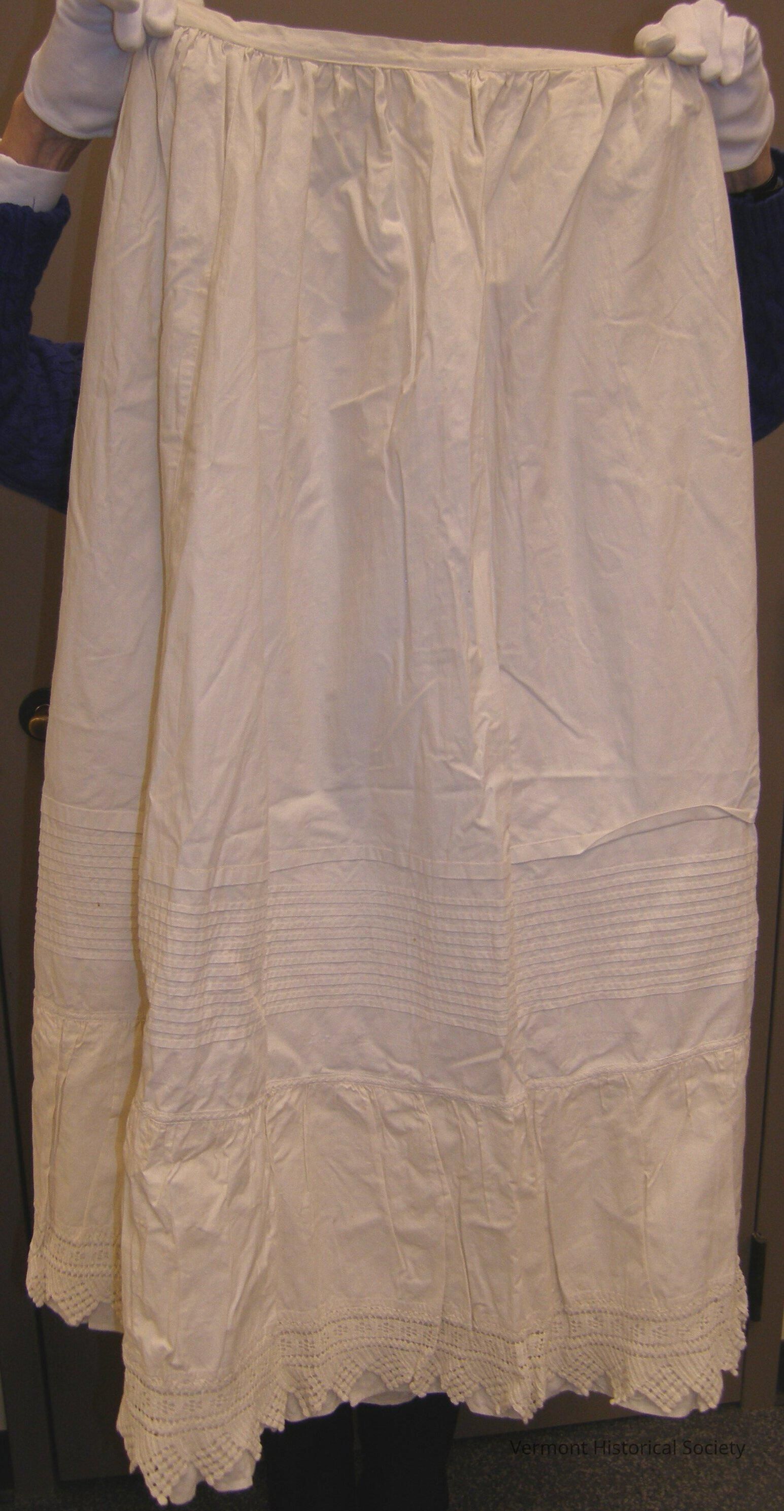 White cotton petticoat. The skirt is gathered to a narrow waistband that secures in the center back with a button. There is an 8-inch wide flounce at the bottom of the petticoat, edged in 3-1/3-inch wide crocheted lace in a grape pattern. Above the flounce are 11 horizontal tucks of the same width, and one larger tuck (at the top).