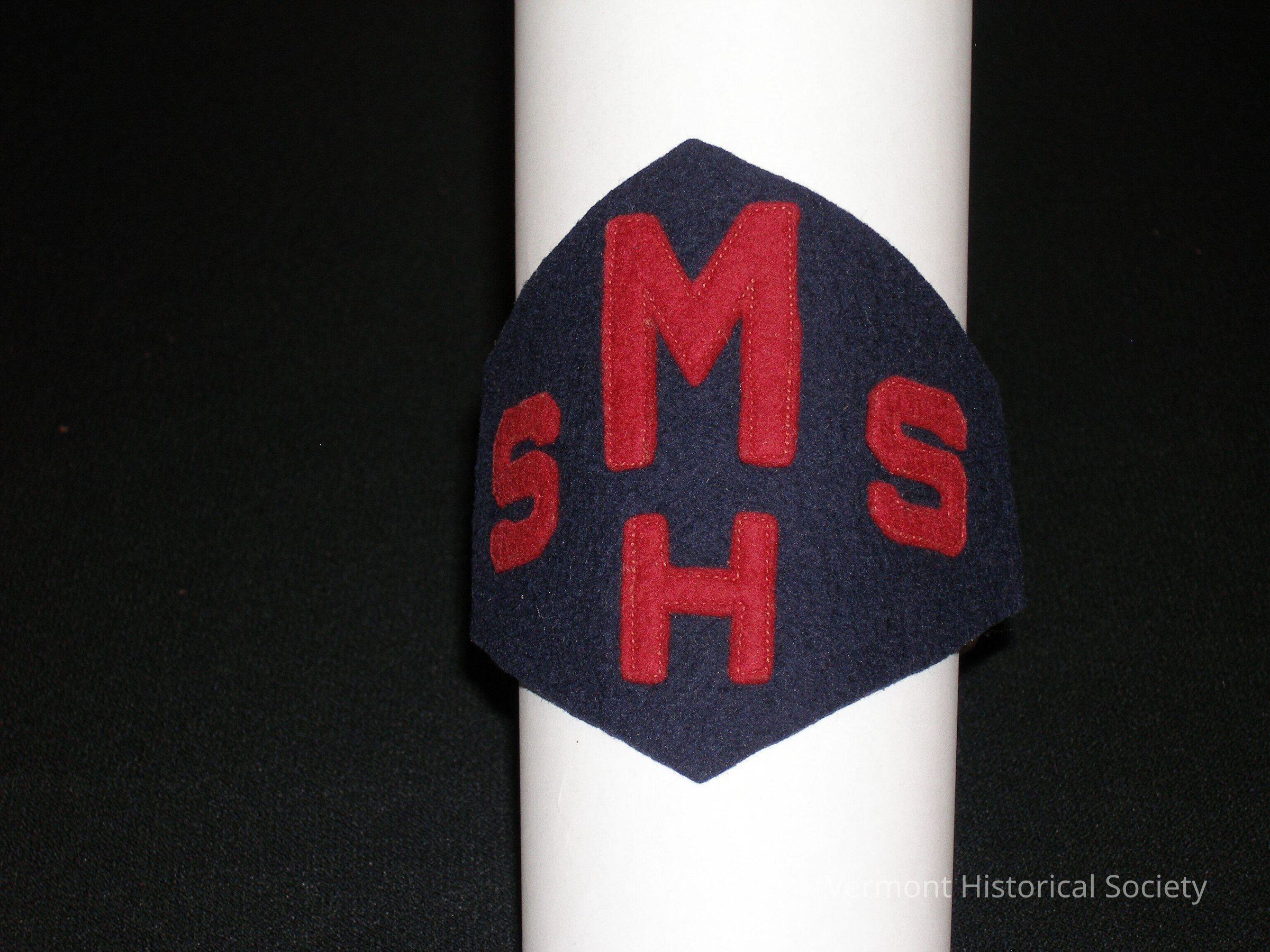 Diamond-shaped blue felt armband appliquéd with the letters M. S. H. S. in red felt. A short length of black elastic stretches between the two side points across the back.