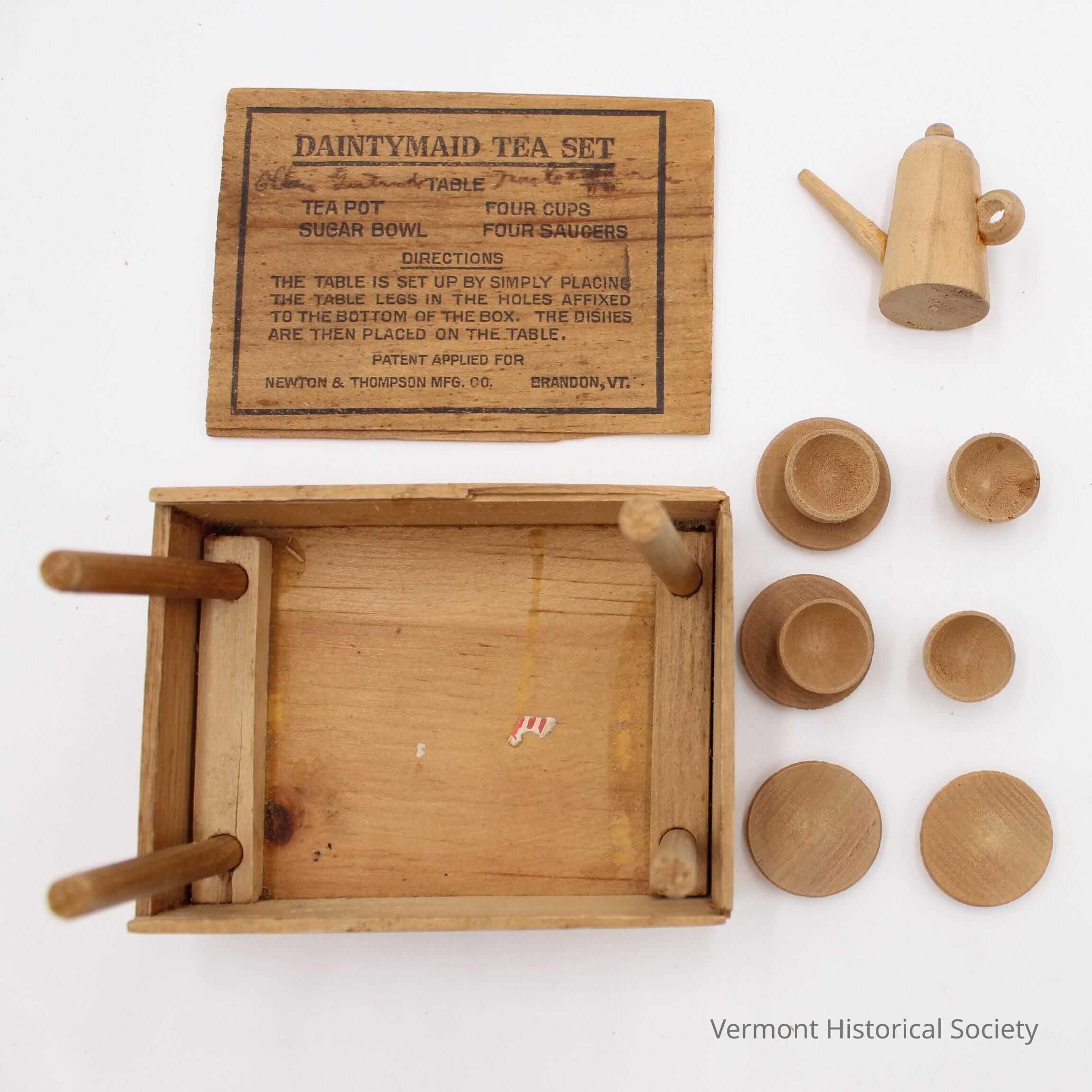 Box with a miniature wooden tea set. The box uses four dowels to become a table for the set. The miniatures include a teapot, four cups, and four saucers. The lid of the box is printed with the name ("DAINTYMAID TEA SET") as well as the contents and directions.Context