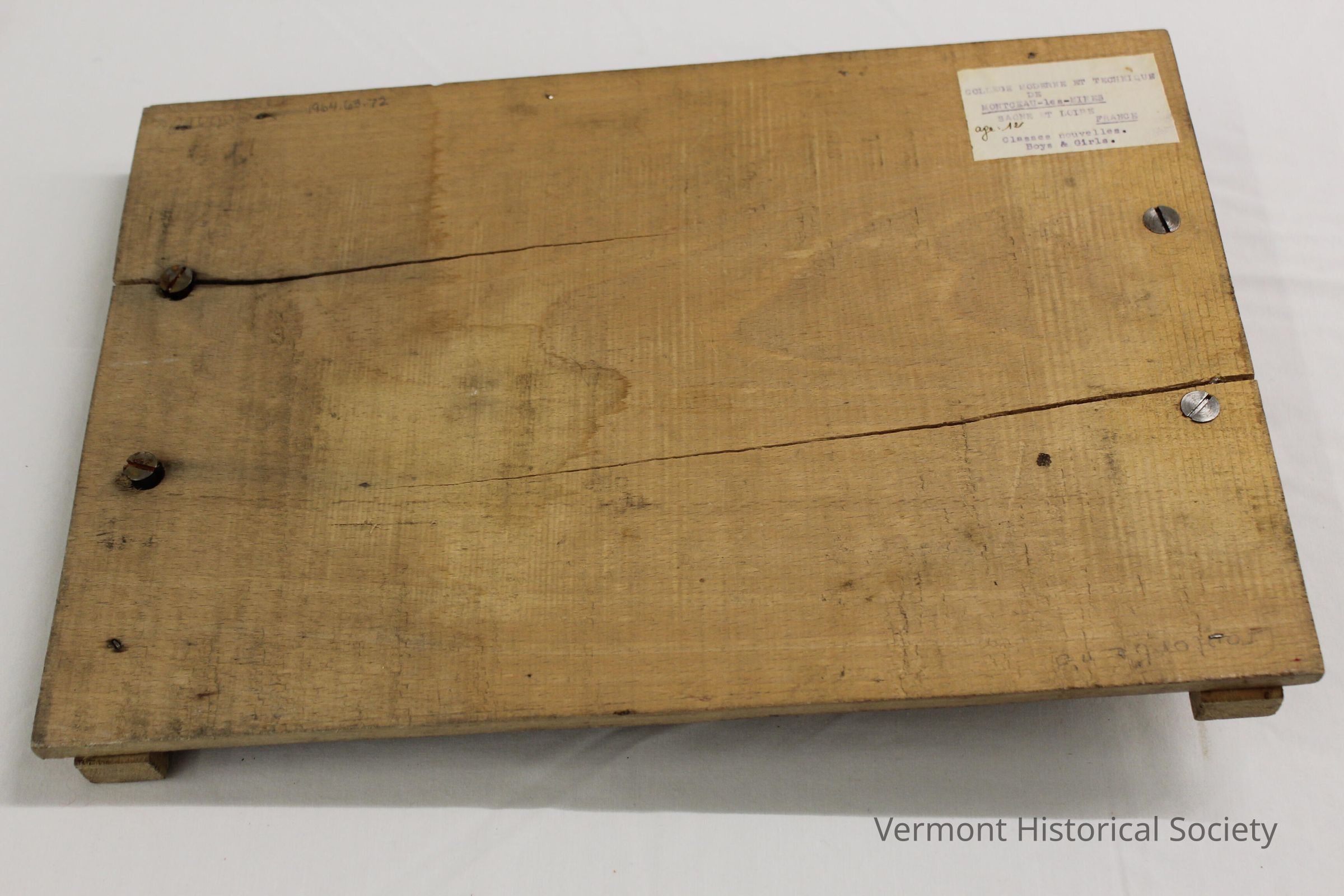 Wooden serving tray made by students at the College Moderne et Technique. One handle is broken off and there are cracks in the wooden surface. There are pencil marks on the top and bottom.