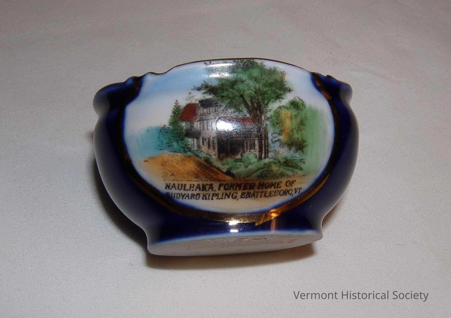 Small porcelain nut dish with blue glaze on the outside. One side is printed with an illustration of a large a large house beside a road labeled, "NAULHAKA, FORMER HOME OF RUDYARD KIPLING, BRATTLEBOROR, VT." The bottom of the dish is marked, "Jonroth. Painted and Imported for Brattleboro China Store Brattleboro Vt, Germany."Context