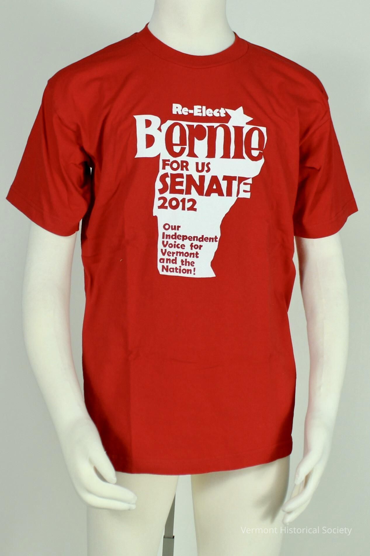 Red t-shirt printed with white. On the front, the inscription, "Re-Elect Bernie FOR US SENATE 2012 / Our Independent Voice for Vermont and the Nation!" over an outline of the state of Vermont. The back is printed with, "Re-Elect Bernie FOR US SENATE 2012 www.bernie.org".Context