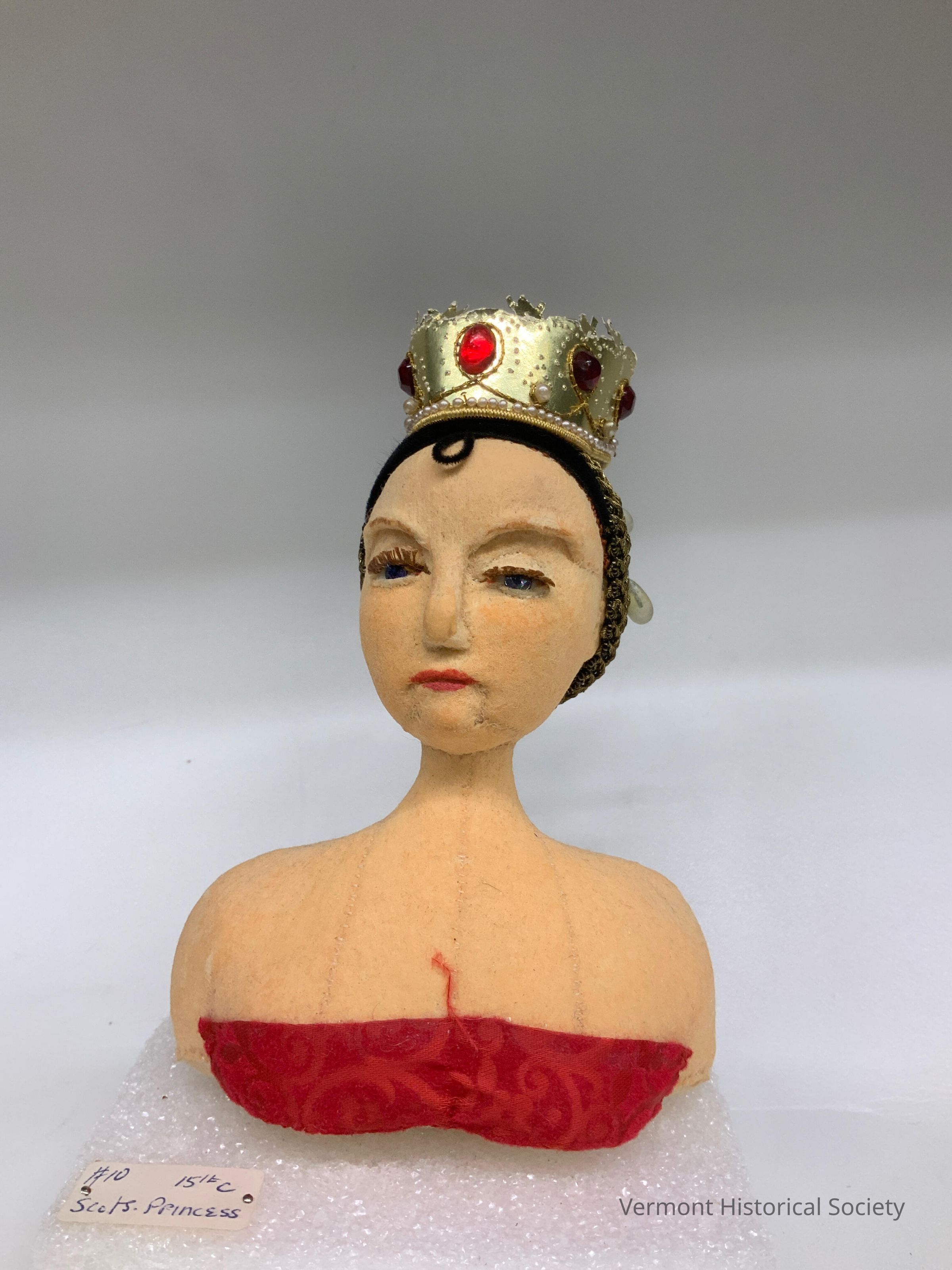 The bust is inserted into a Styrofoam base with two metal wires. The base has a paper label that reads, “#10 15thc Scots Princess".Use