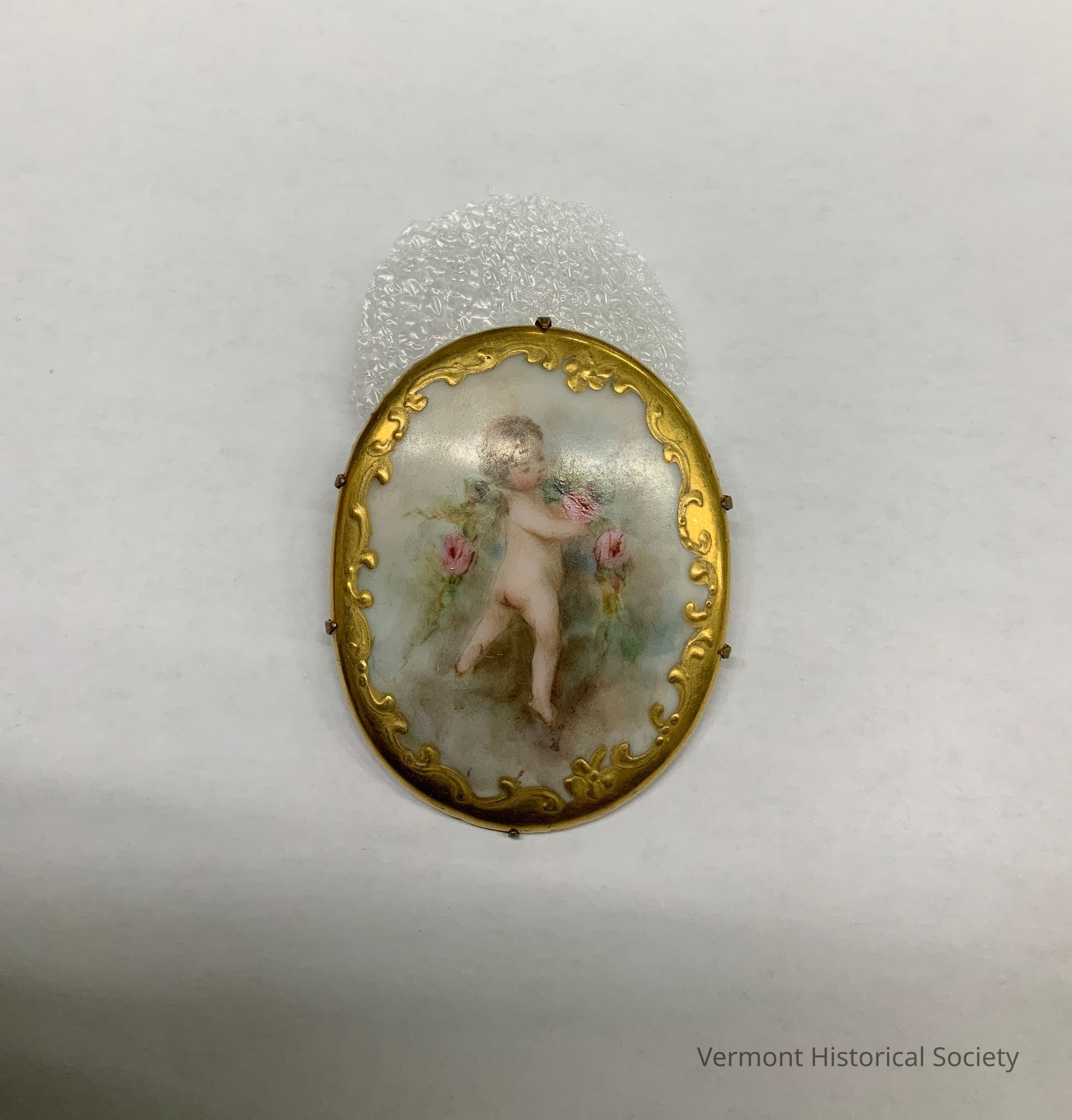 Oval brooch consisting of an oval disk painted with the image of a nude toddler surrounded by pink roses. The disk has a gilded border, and is held to the brooch back with 6 prongs.