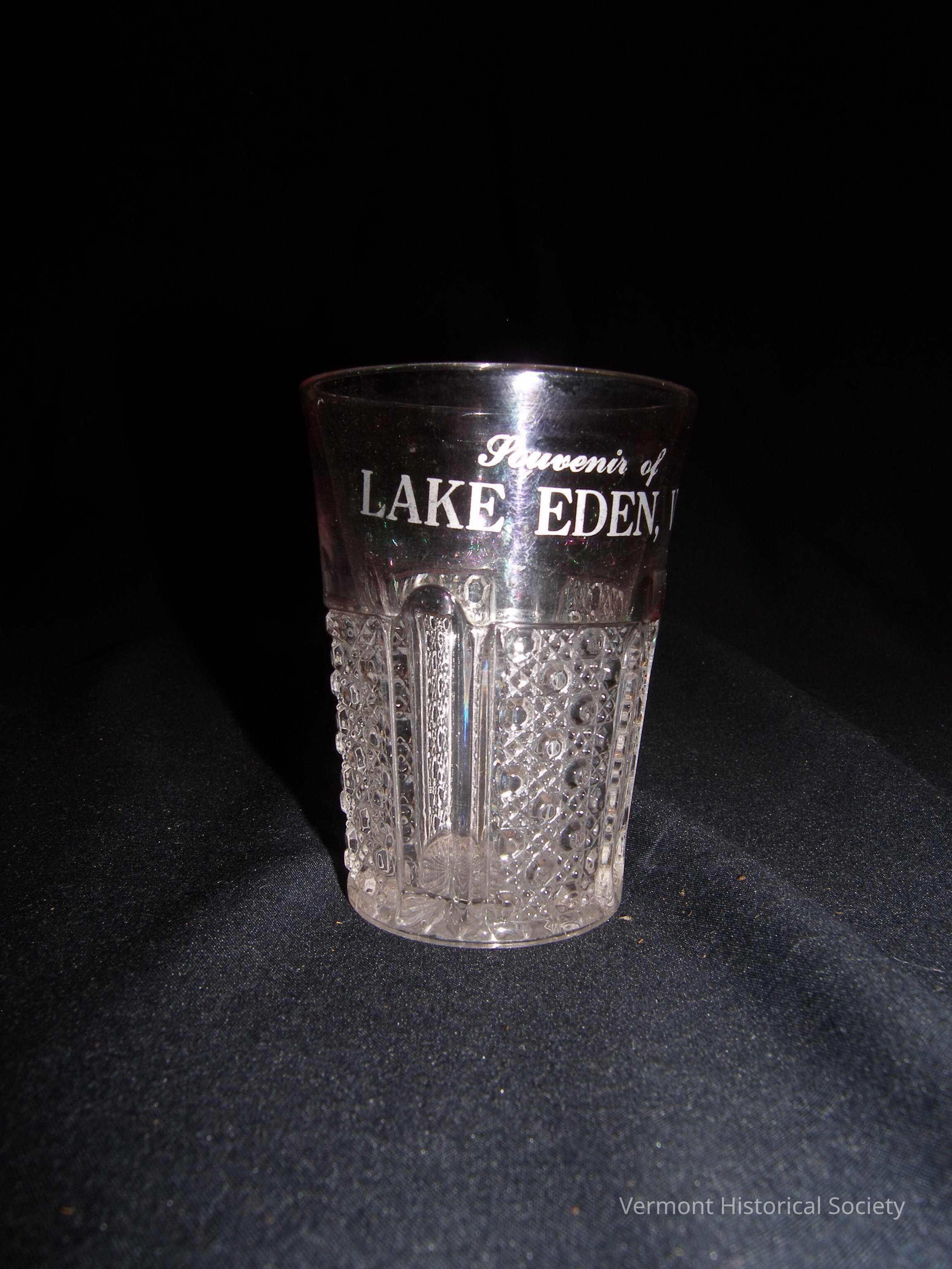 Molded glass souvenir tumbler. The bottom portion of the glass is faceted to look like cut crystal. The top portion was previously opalescent (now worn away) and is printed in white with the words, "Souvenir of LAKE EDEN, VT."