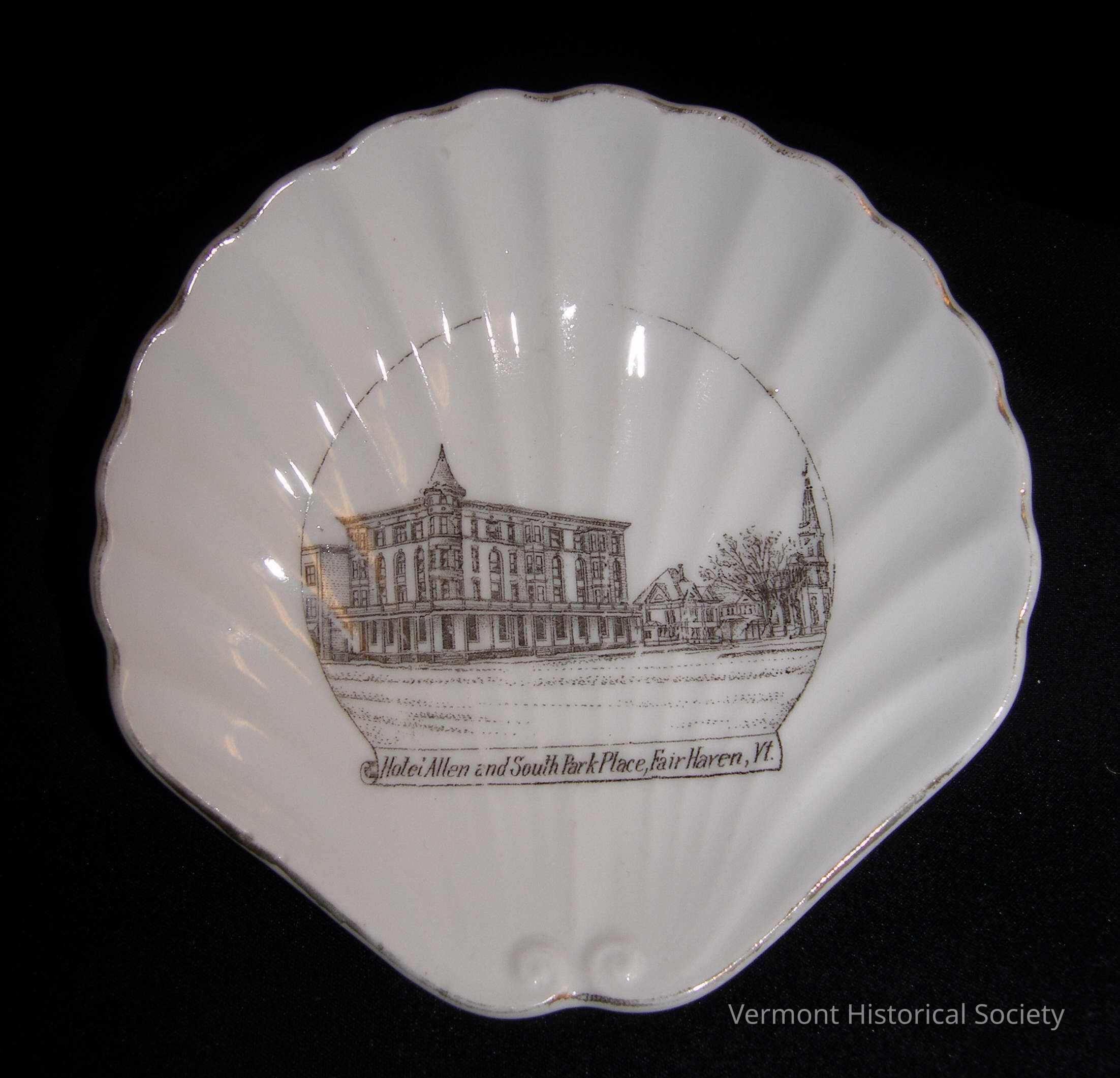 Shallow dish shaped like a scallop shell and printed with a city street scene largely taken up by a large building that spans a full block. The image is labeled, "Hotel Allen and South Park Place, Fair Haven, Vt." The bottom is marked, "WHEELOCK Made in Germany for A. L. MINCH Fair Haven, Vt."Context