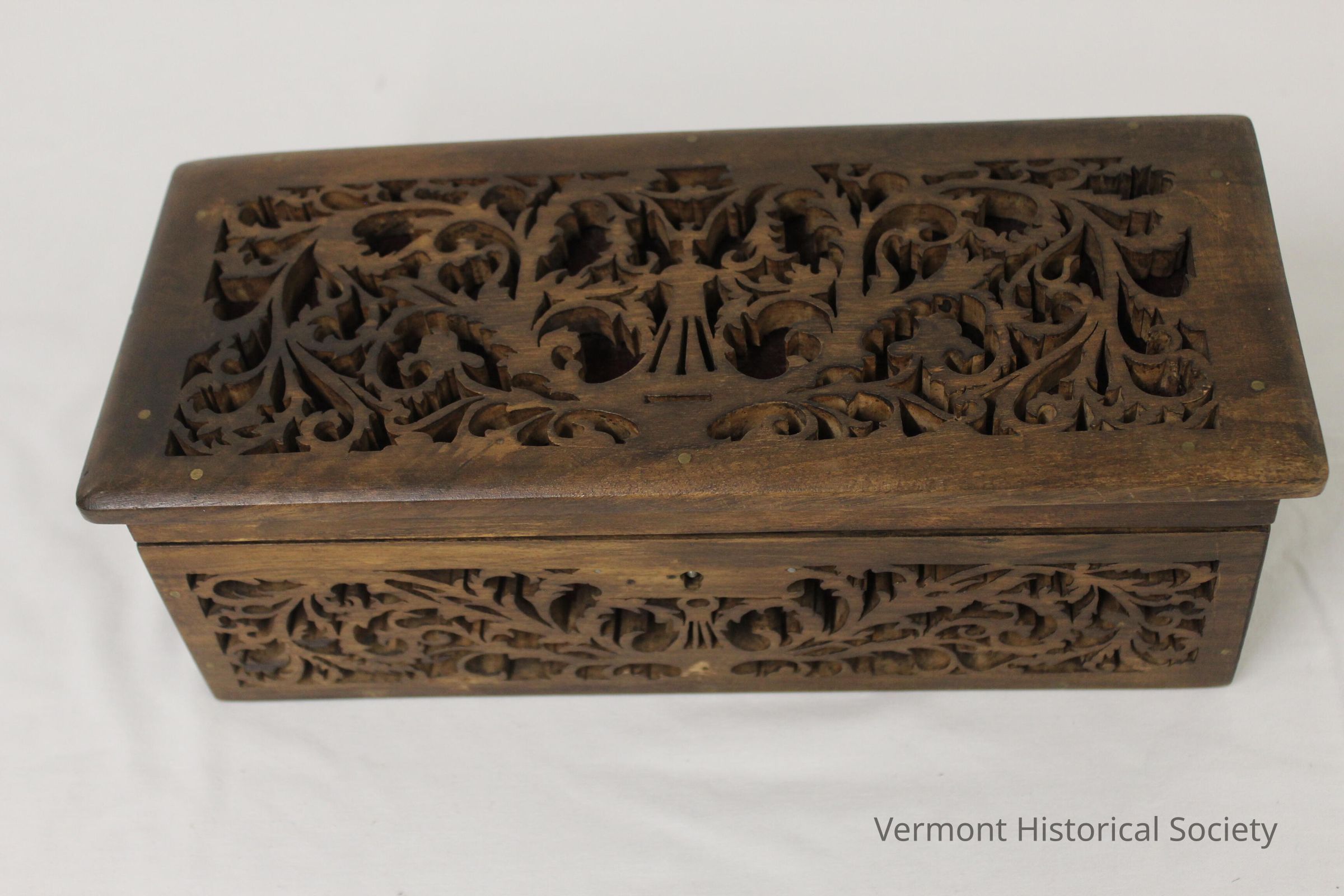 An intricately carved wooden box with a key. A previous display label says it is a glove box from the orphanage of the Trinitarian Nuns of Lyon. The carving is of vines, with a cross on the lid. It is lined with red velvet.
