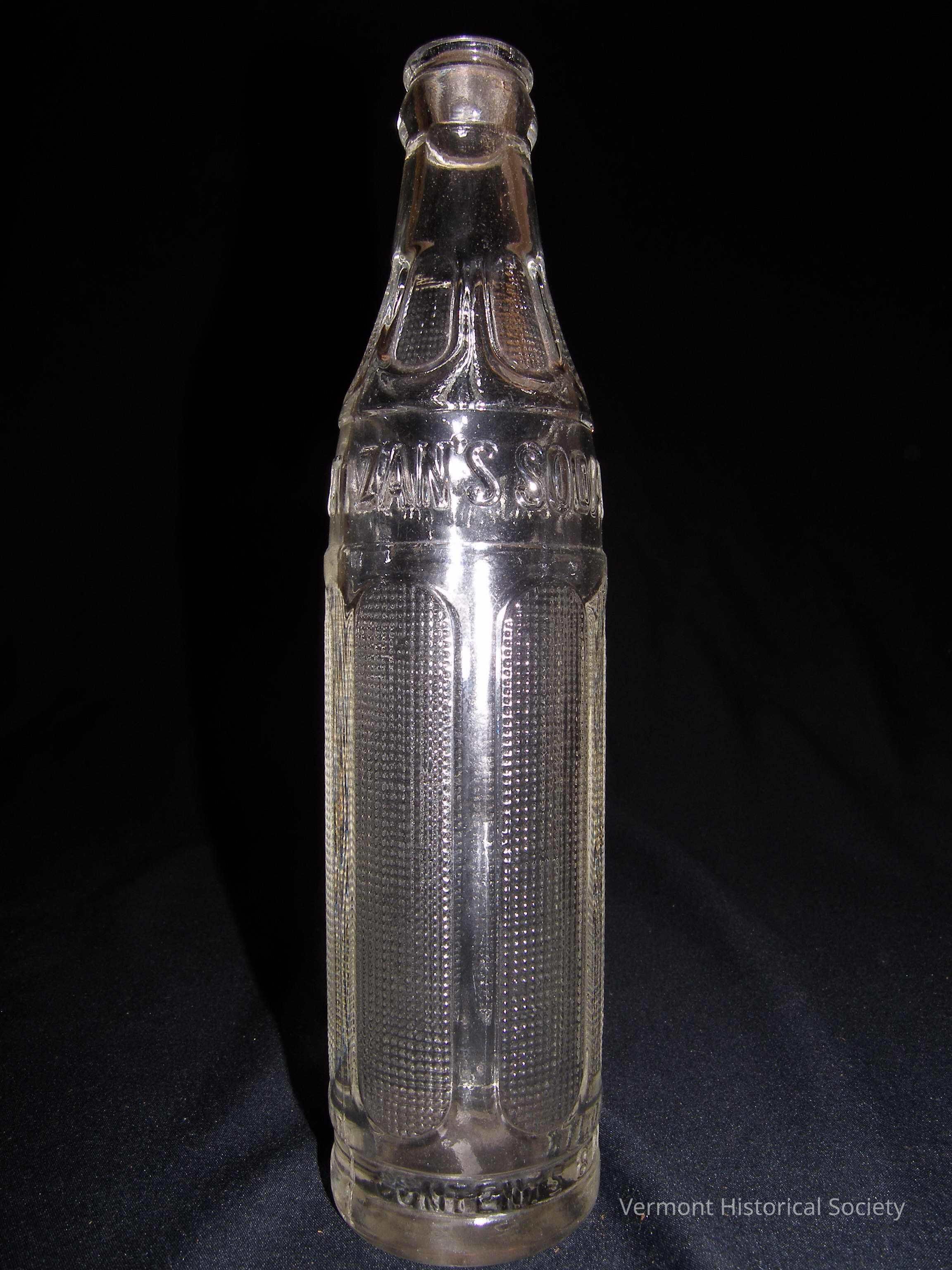 Clear glass bottom with textured ovals around the middle. The shoulder is molded with the inscription, "Zan's Sodas, Inc. Barre, Vermont." The base is molded with the inscription, "CONTENTS 8 FL. OZ. REGISTERED".Context