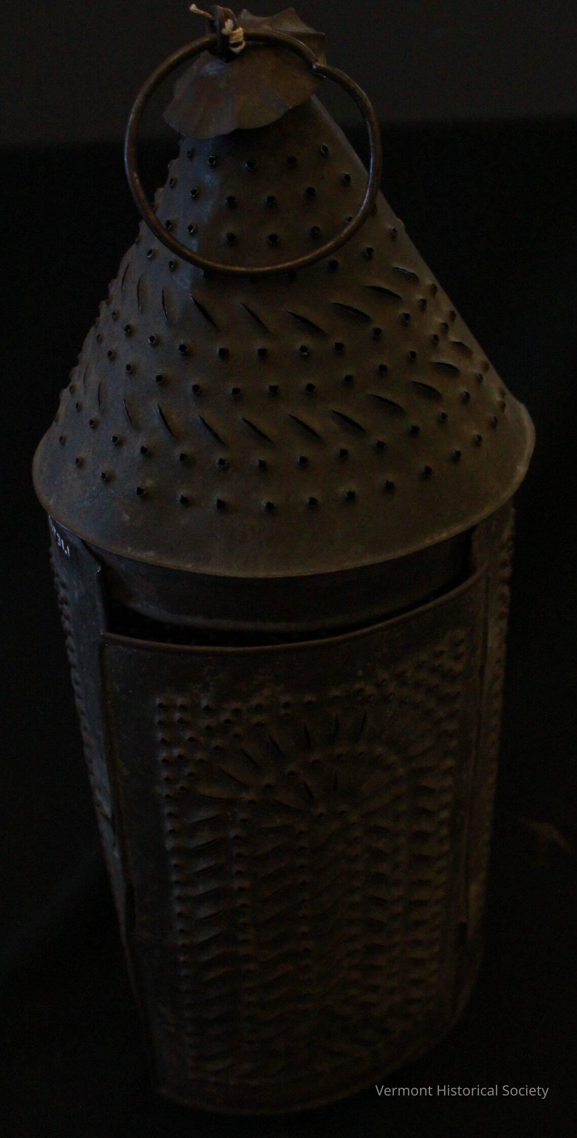 Pierced tin lantern. The lantern body is round and formed from a single sheet of tin. The top is conical, formed from a circular sheet of tin rolled around the center point. There is a narrow rectangular door on one side that secures with a bent metal latch. The body, top, and door are all pierced from the interior in a decorative pattern of dots and lines. The round metal base has a circle in the center for holding a candle.Context