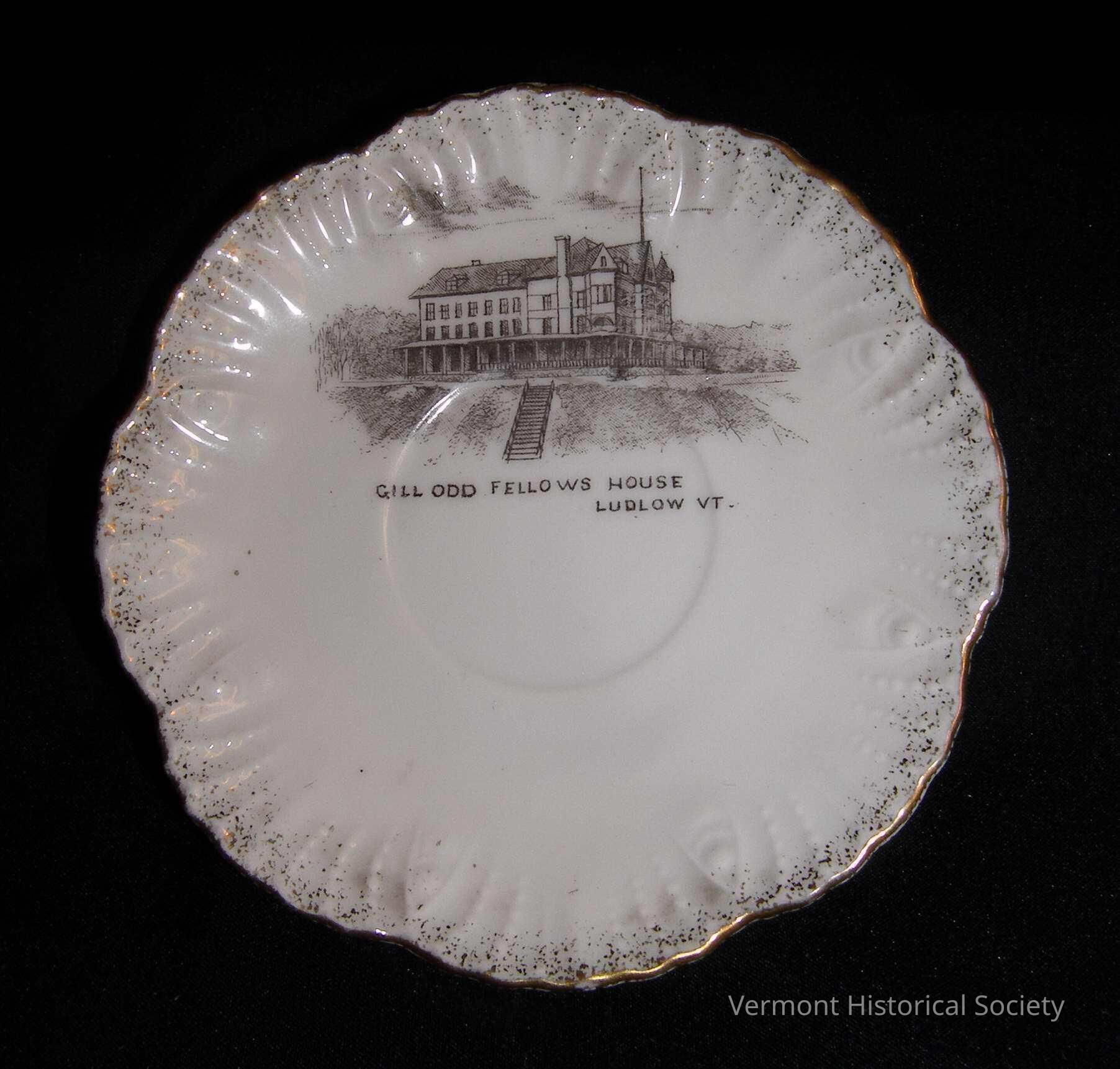 White ceramic saucer with scalloped and gilded edge. The top center is printed with an engraved illustration of a large building with a covered porch at the top of a hill. The image is labeled, "GILL ODD FELLOWS HOUSE LUDLOW VT." The bottom of the dish is marked, "B.F.H.S. CHINA MADE IN AUSTRIA For John Barrett Ludlow Vt."