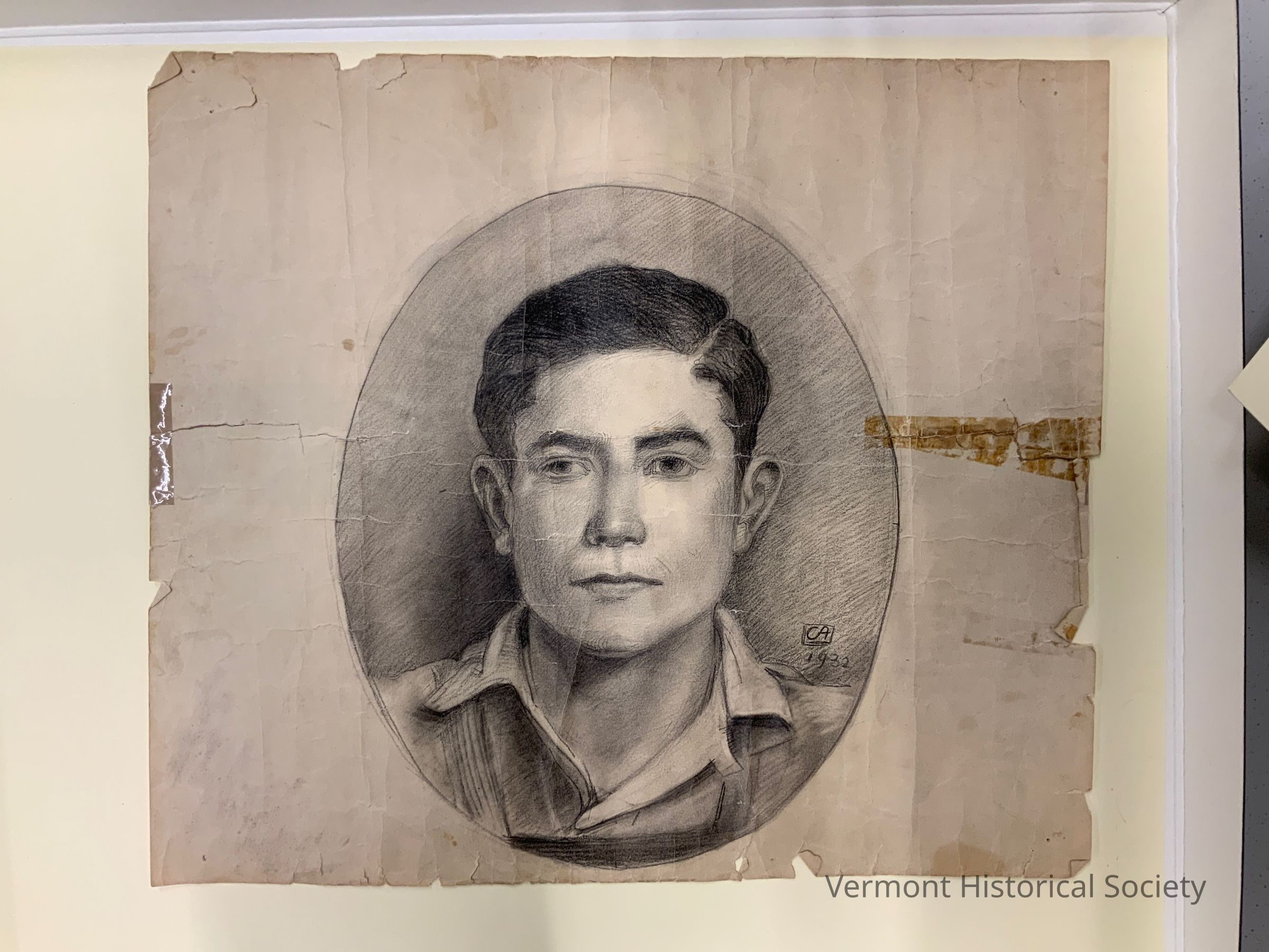 Portrait sketch showing a young man. The composition is within an oval and there is a shaded background. The man has short hair parted to one side. He is wearing bib overalls and a collared shirt. His eyes are slightly misaligned with one facing the viewer and one facing the viewer's left.Type of Drawing