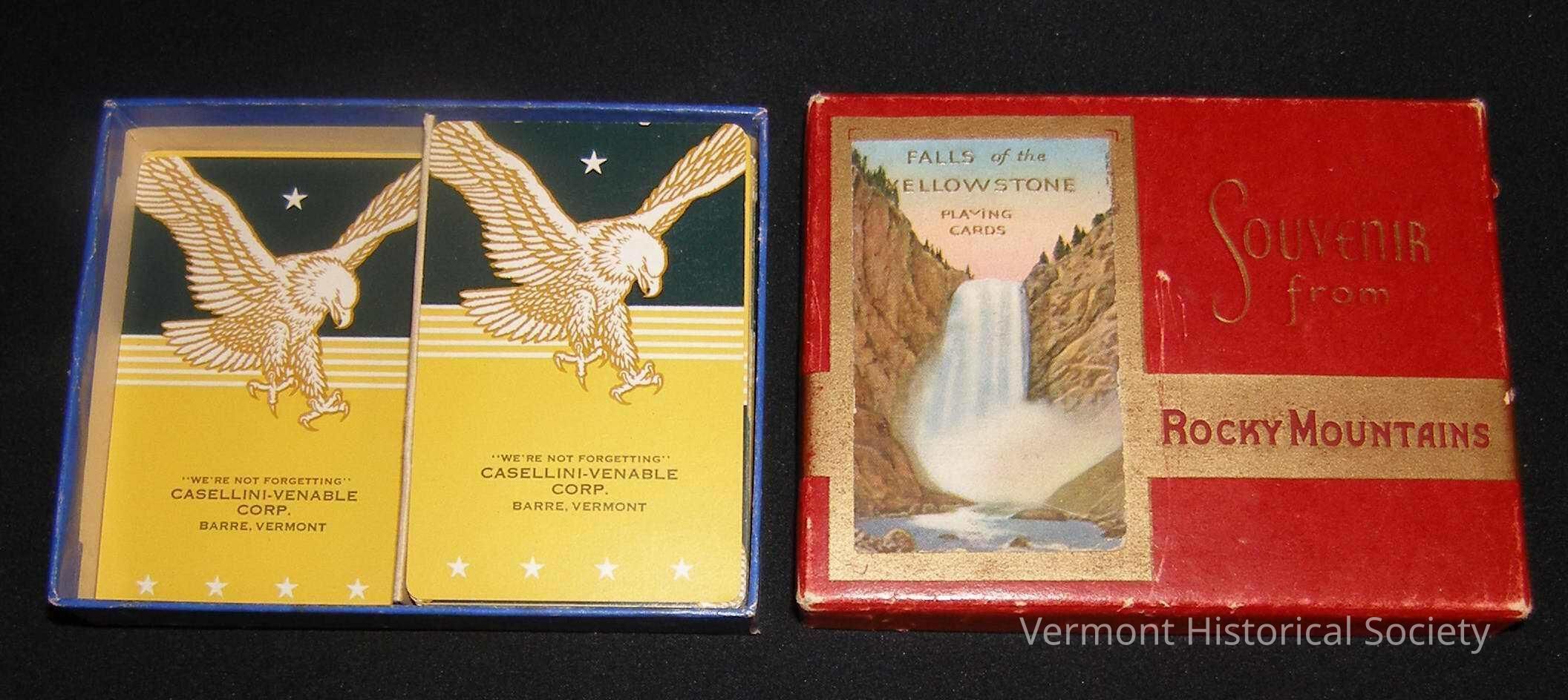 52-card deck of playing cards in a souvenir box (not original). The cards are of the standard suits. The back of each card is printed in black and yellow with an illustration of a flying eagle and the inscription, "'WE'RE NOT FORGETTING' CASELLINI-VENABLE CORP. BARRE, VERMOTN". The box is printed with an illustration of a waterfall and the inscription, "Souvenir from Rocky Mountains".