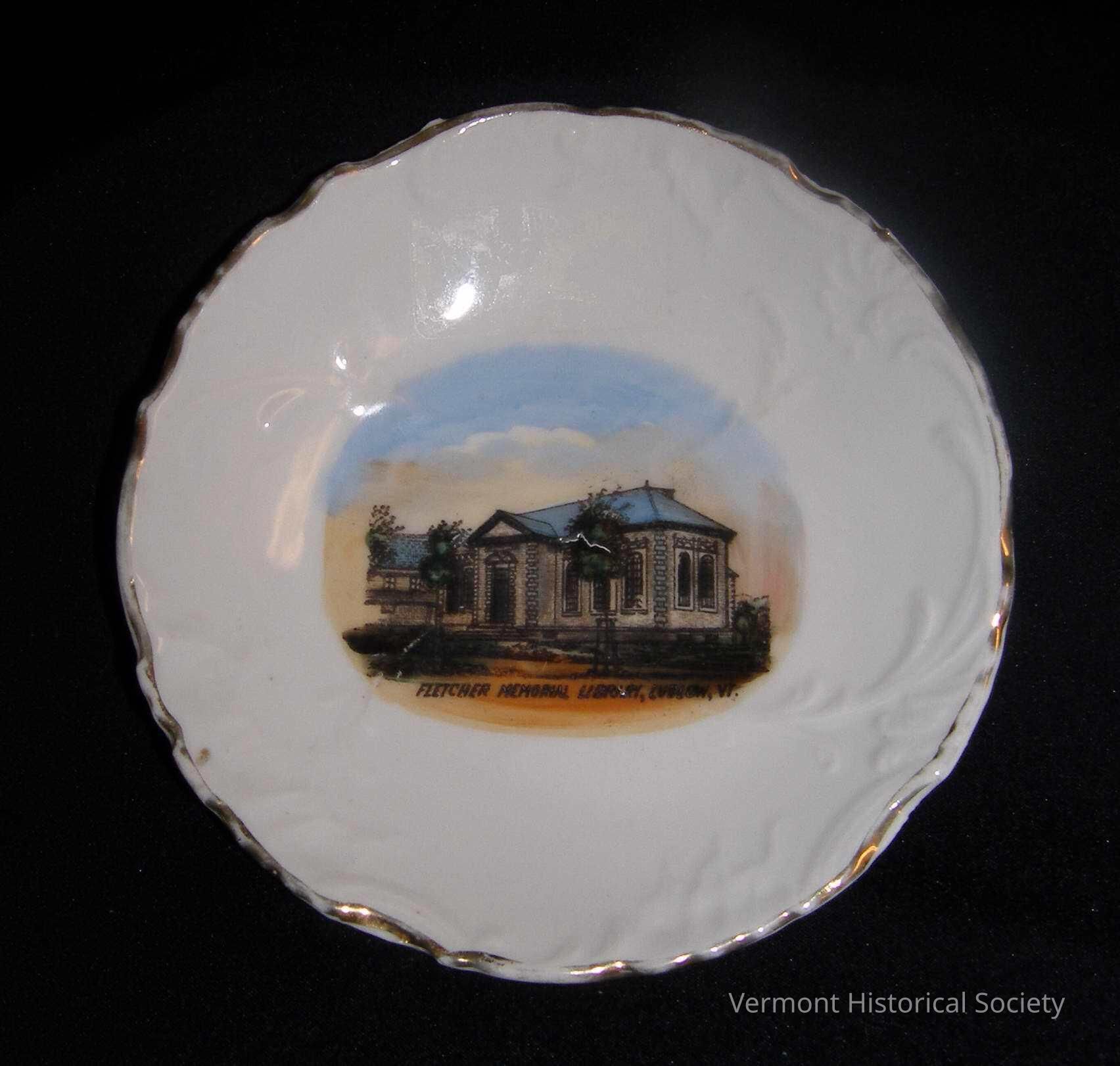 White ceramic bowl printed at the center with a full-color illustration of a stone building with a blue hipped roof labeled, "FLETCHER MEMORIAL LIBRARY, LUDLOW, VT." The bottom of the dish is marked, "WHEELOCK MADE IN GERMANY FOR JOHN BARRETT LUDLOW, VT. DRESDEN."Context