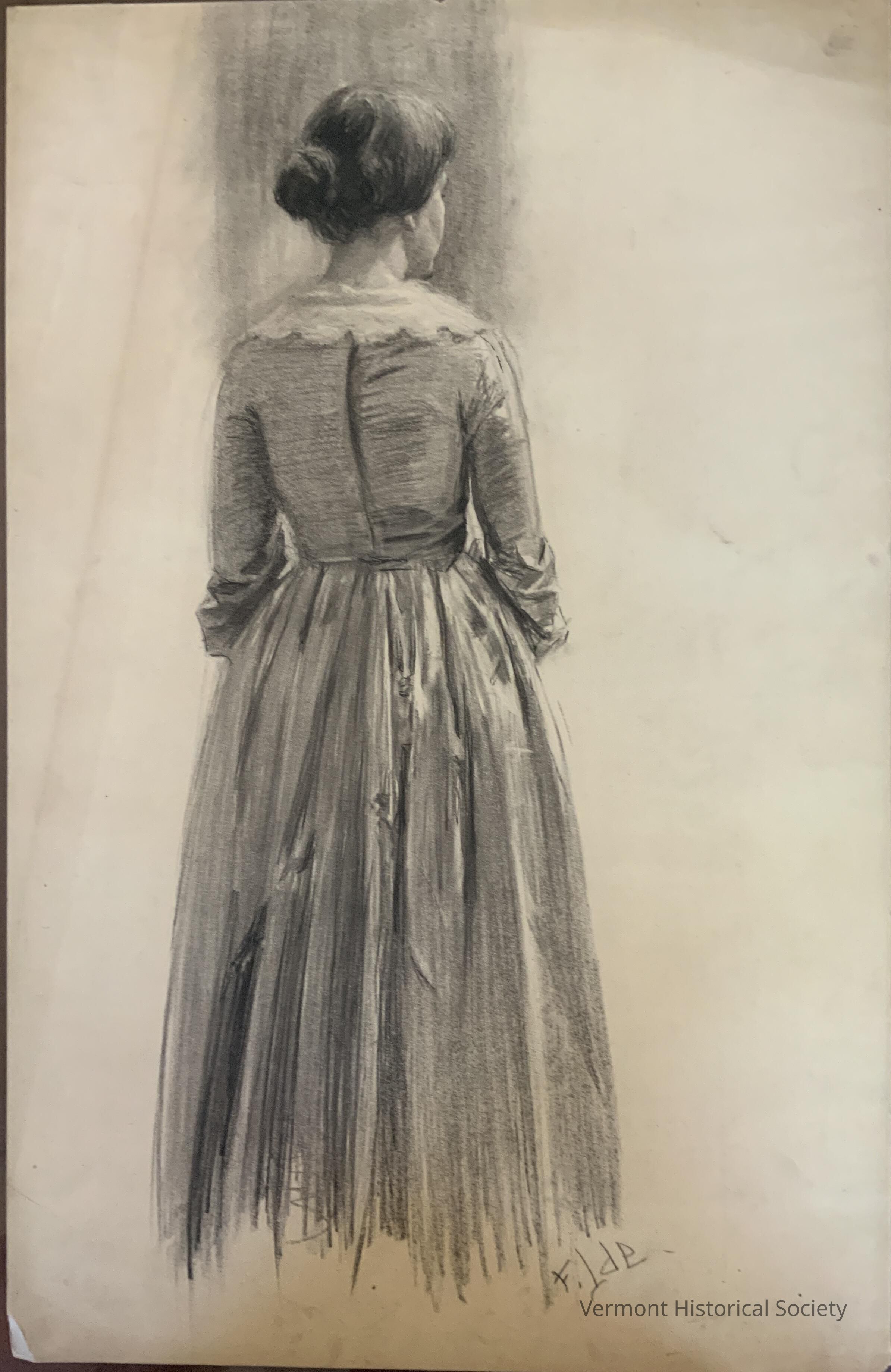 A drawing of a woman from behind. She has a full skirt and a scalloped collar. Her hair is in a low bun. There is shadow in front of her. It is signed in the bottom right corner.Type of Drawing