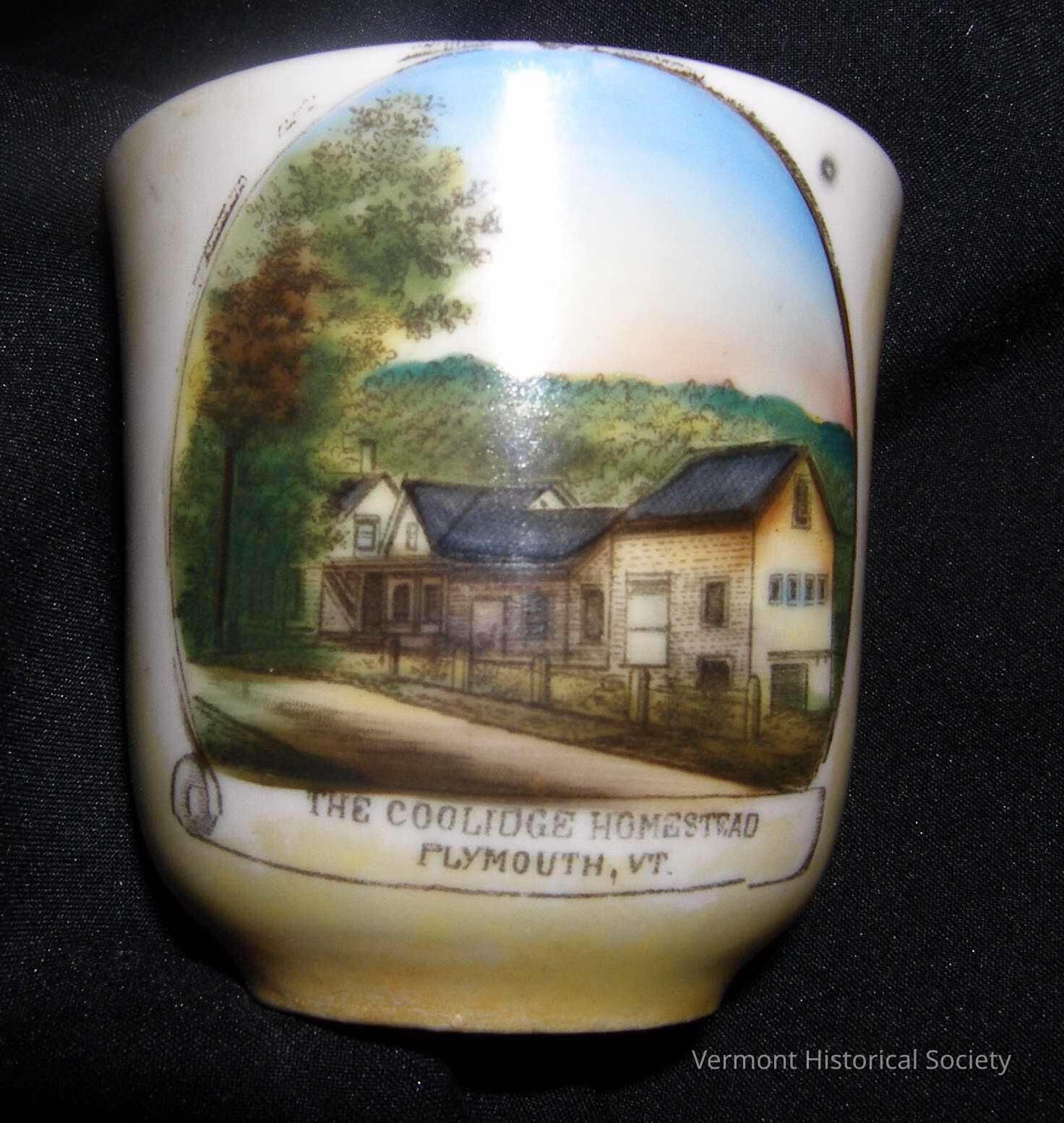 White ceramic demitasse cup with gilded handle and unevenly applied green glaze. The cup is printed with a full-color illustration of a clapboard house complex labeled, "THE COOLIDGE HOMESTEAD POLYOUTH, VT." The bottom is marked, "INTED AND IMPORTD MISS RUTH M. ALDRICH PLYMOUTH, VT."