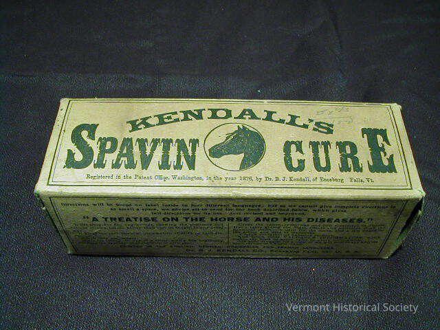 Cardboard box. This rectangular box has a black printed frame border and an image of a horse mostly in silhouette contained in a circle. The words “Kendall’s / SPAVIN CURE” in large black printed lettering and frame the horse image. In small print, the words “Registered in the Patent Office, Washington, in the year 1876, by Dr. B.J. Kendall, of Enosburg Falls, Vt.” underline the central image and larger printed lettering. The cardboard is empty and has no added coloring besides the black printed lettering on all sides.Context