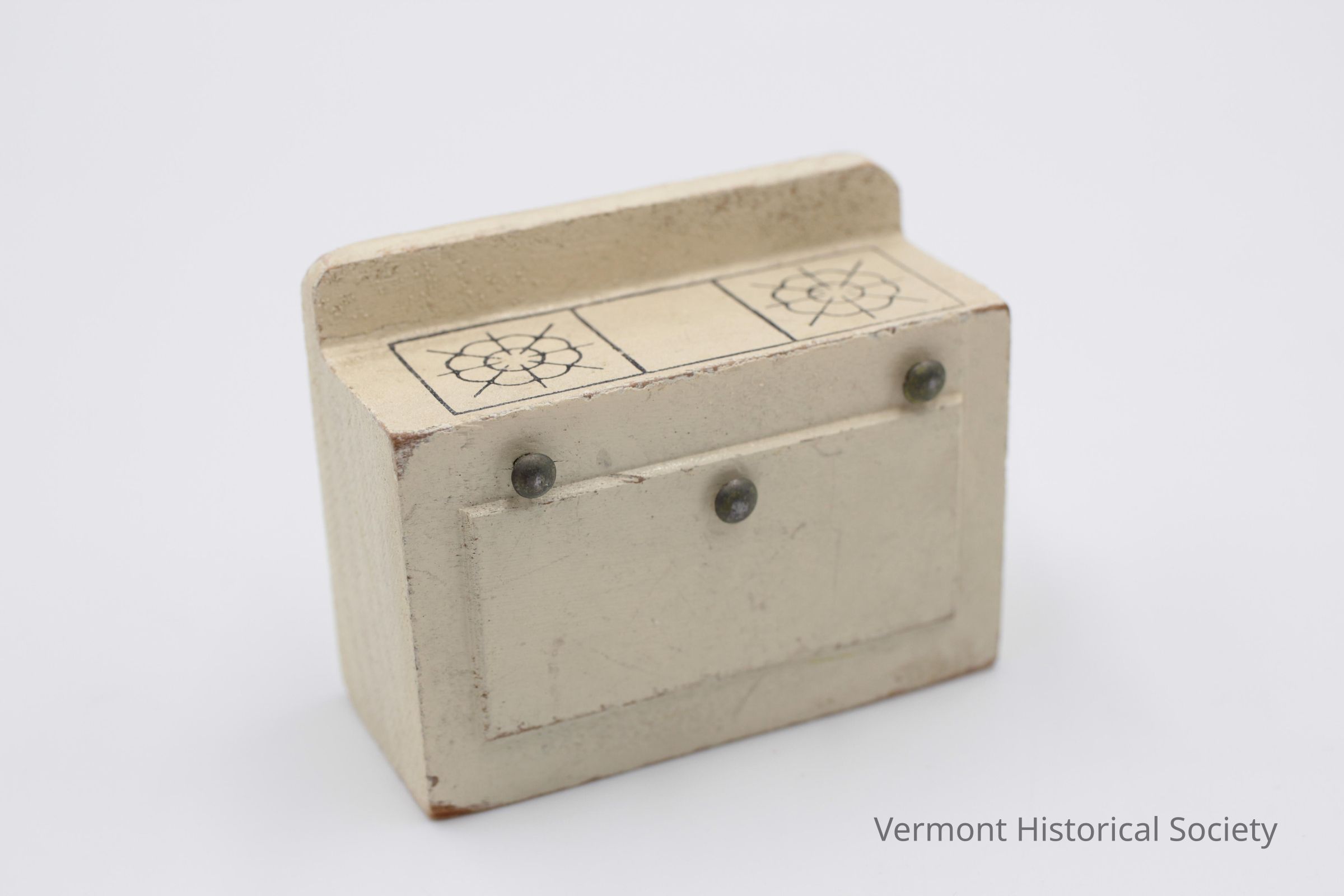 Miniature wooden oven sized for a dollhouse. The oven consists of a rectangular block with a backboard. The block is printed with the outlines of two burners top, and the front has an attached rectangular block representing an oven door and three knobs.Context