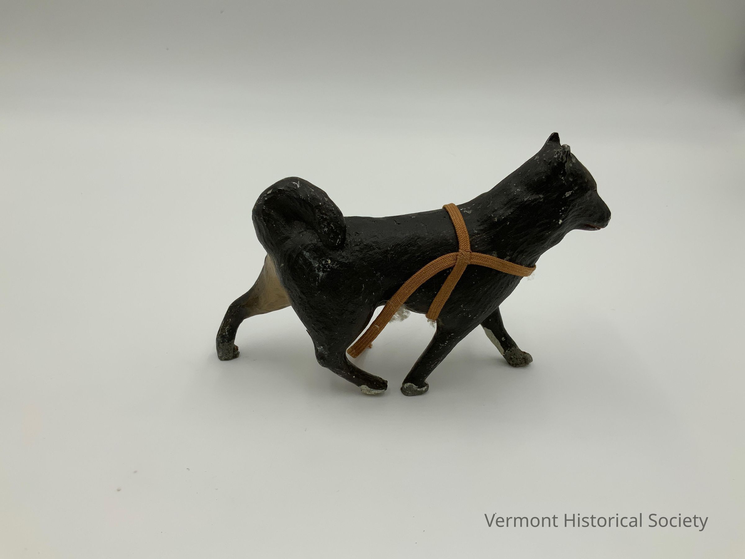 Miniature cast-iron sled dog. The dog is molded to appear as if it's walking, and there is a harness made of woven cotton tape around its body. It is painted in black. Its tail is curved over its back.
