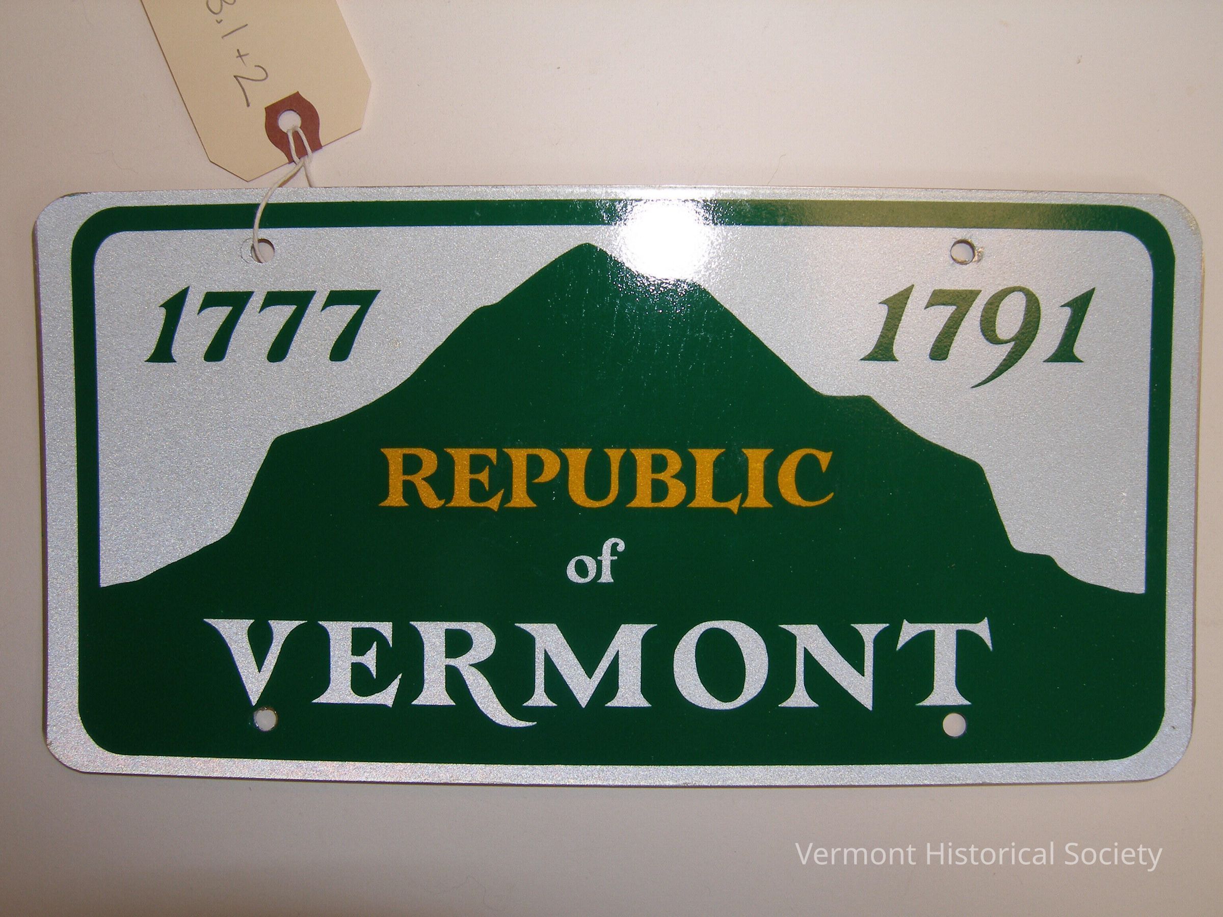 Commemorative license plate that reads, "Republic of Vermont", over a green silhouette of a mountain. The mountain is flanked by the dates 1777 and 1791. The back of the license plate is printed with an explanation of the design and instructions for use.Context
