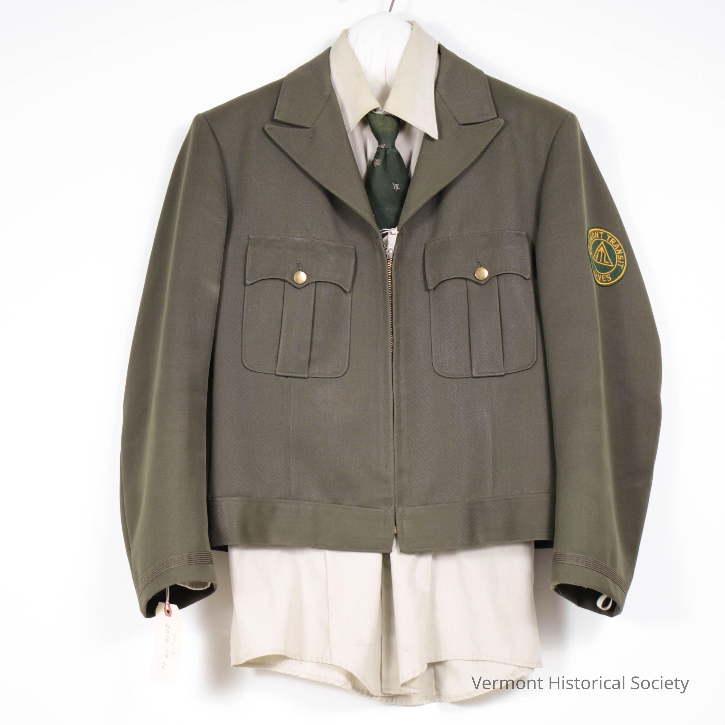 Vermont Transit bus driver's uniform consisting of a jacket, pants, shirt, and necktie.