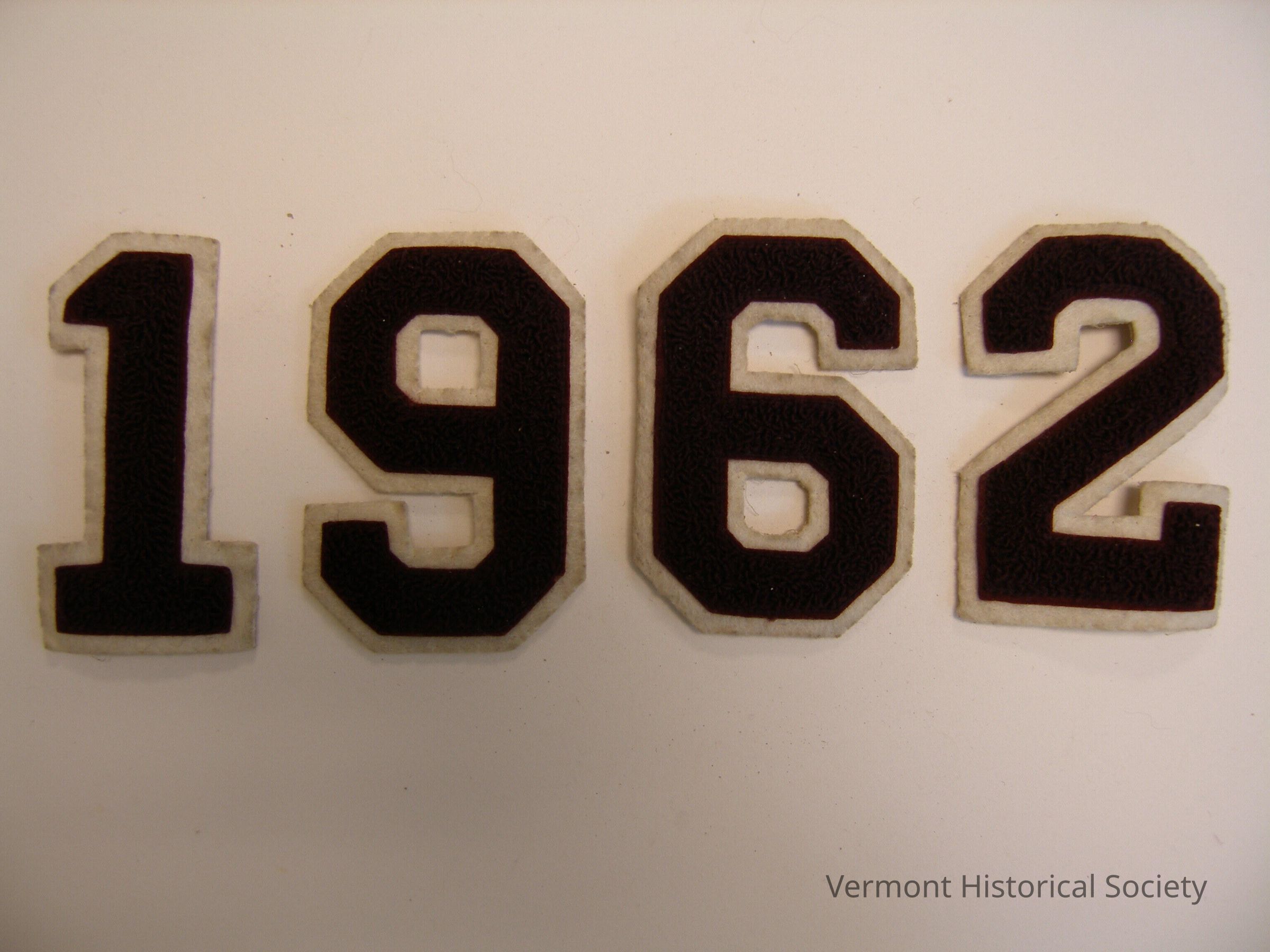 Four varsity letter patches that together spell out the year 1962. Each letter is black felt appliquéd onto white felt. They are each lined with plain-woven cotton.