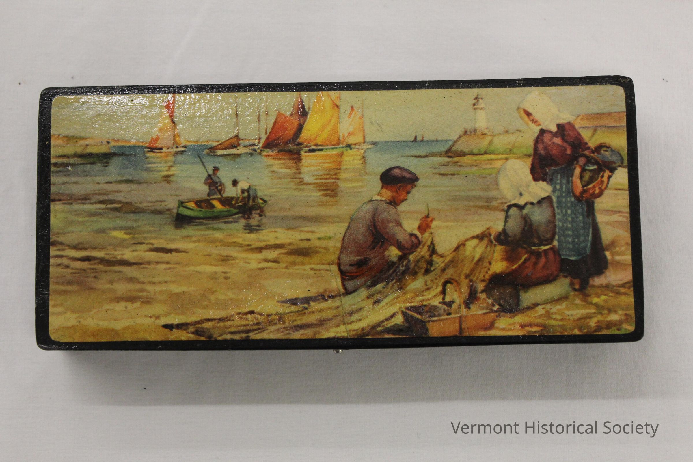A black, lacquered wooden box with a picture of fishermen and boats on the lid and three compartments for pencils, erasers or other smaller items. A button opens the latch. Metal hinges.Context