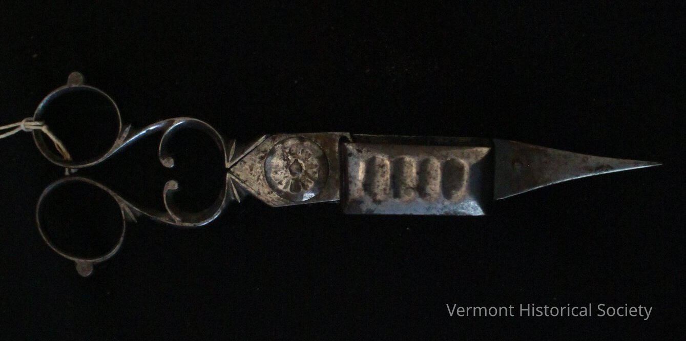 Candlesnuffer and wick trimmer. It is in the form of scissors. One blade has a three-sided box attached to it. There are 2 spokes on the bottom to hold the tool off the resting surface.