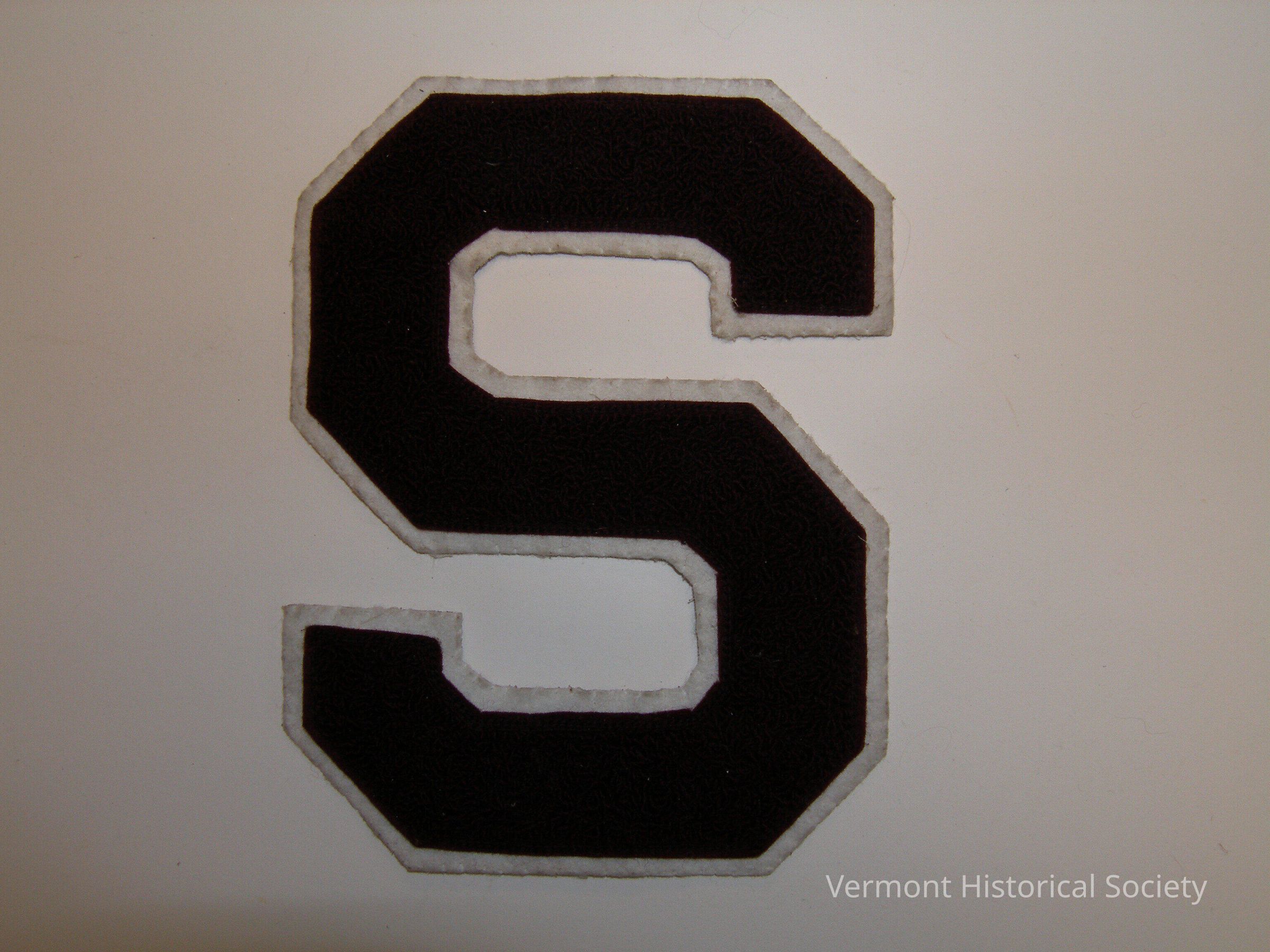 Felt letter S. The letter is made from black felt appliquéd over white felt, with a narrow white border all the way around the letter. The letter is lined with thin, plain-woven white cotton.