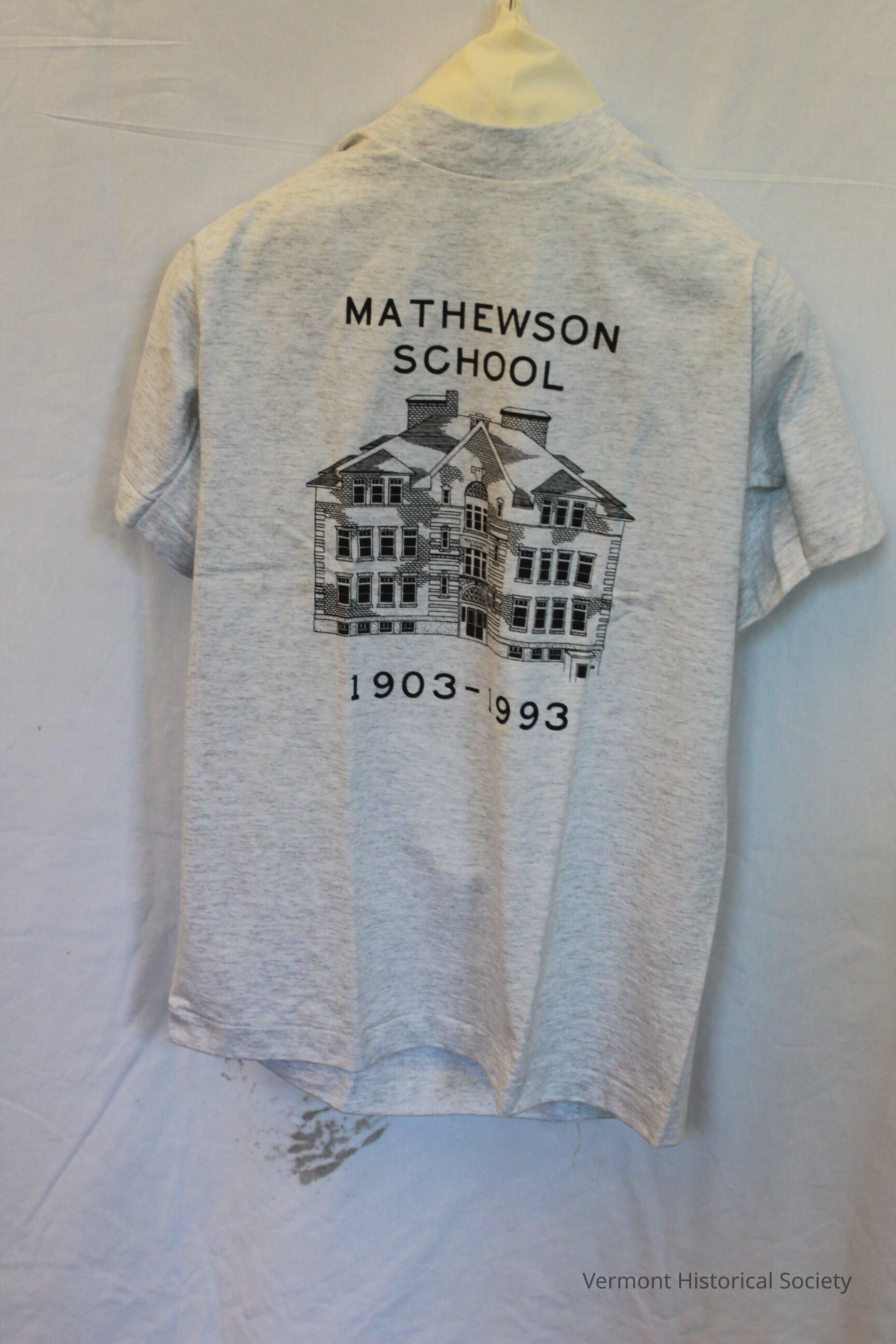 Heather grey t-shirt printed in black with the inscription "MATHEWSON SCHOOL" and "1903-1993" above and below an illustration of a large brick institutional building with multiple chimneys.