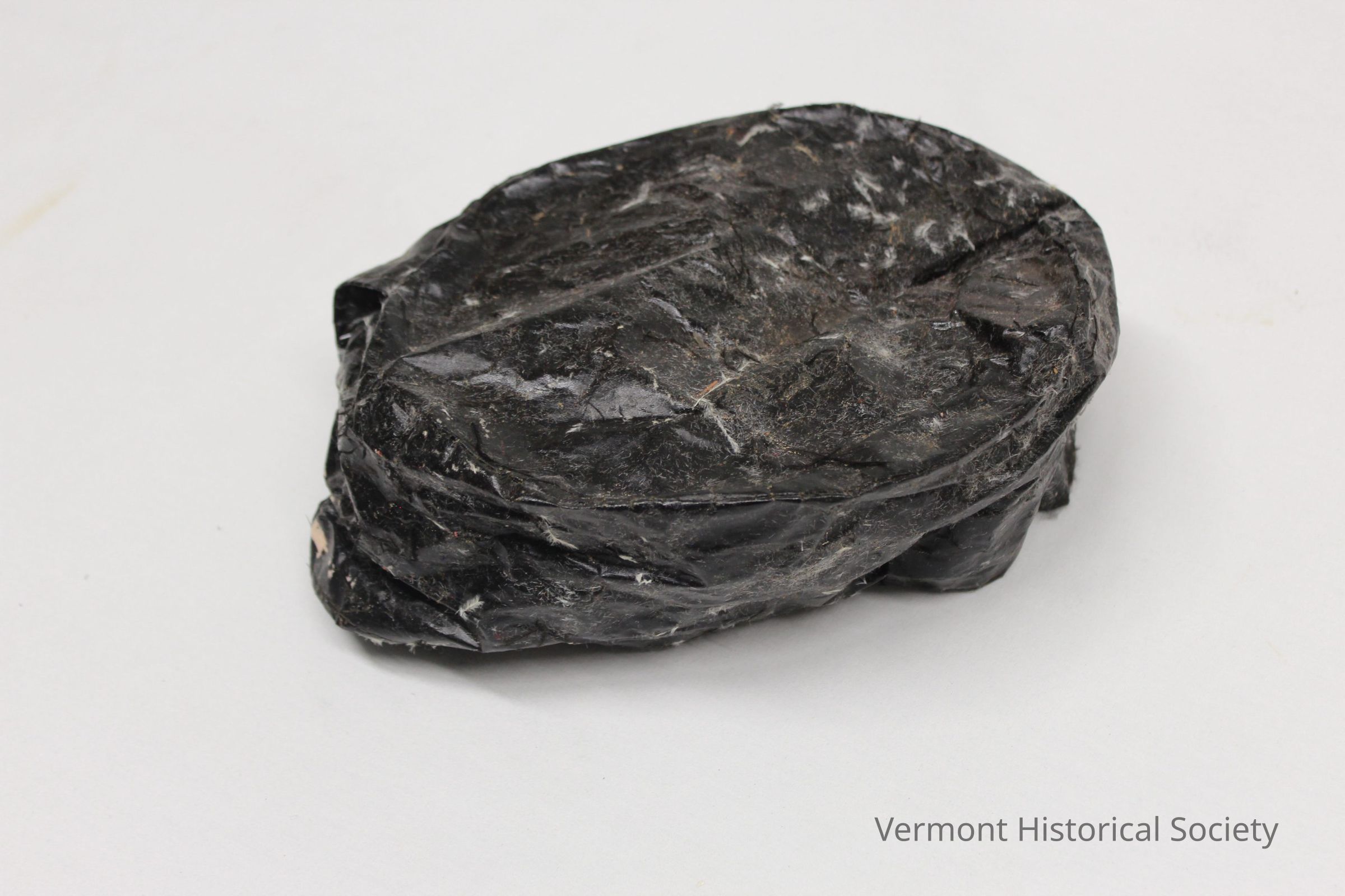 Black oilcloth weather cover for a cap. It has a flat crown over an even-height band to fit snugly over the top of a cap.