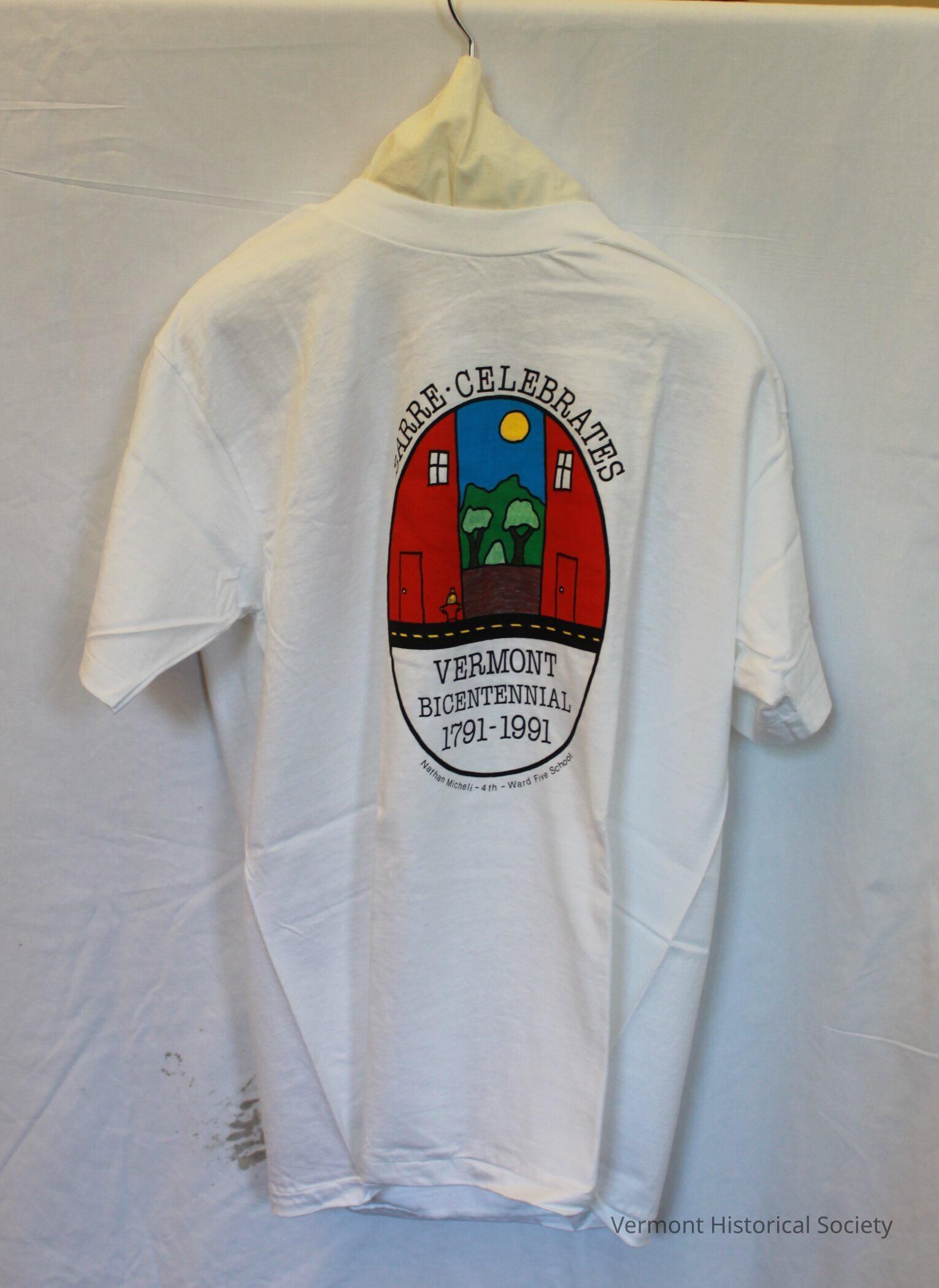 White t-shirt printed with a childlike illustration of two red buildings with an empty lot in between framed within an oval. The words "BARRE CELEBRATES" rings the top edge of the image, and the words, "VERMONT BICENTENNIAL 1791-1991" are at the bottom of the image within the oval. Beneath the frame in tiny letters is the label, "Nathan Micheli = 4th - Ward Five School".Context