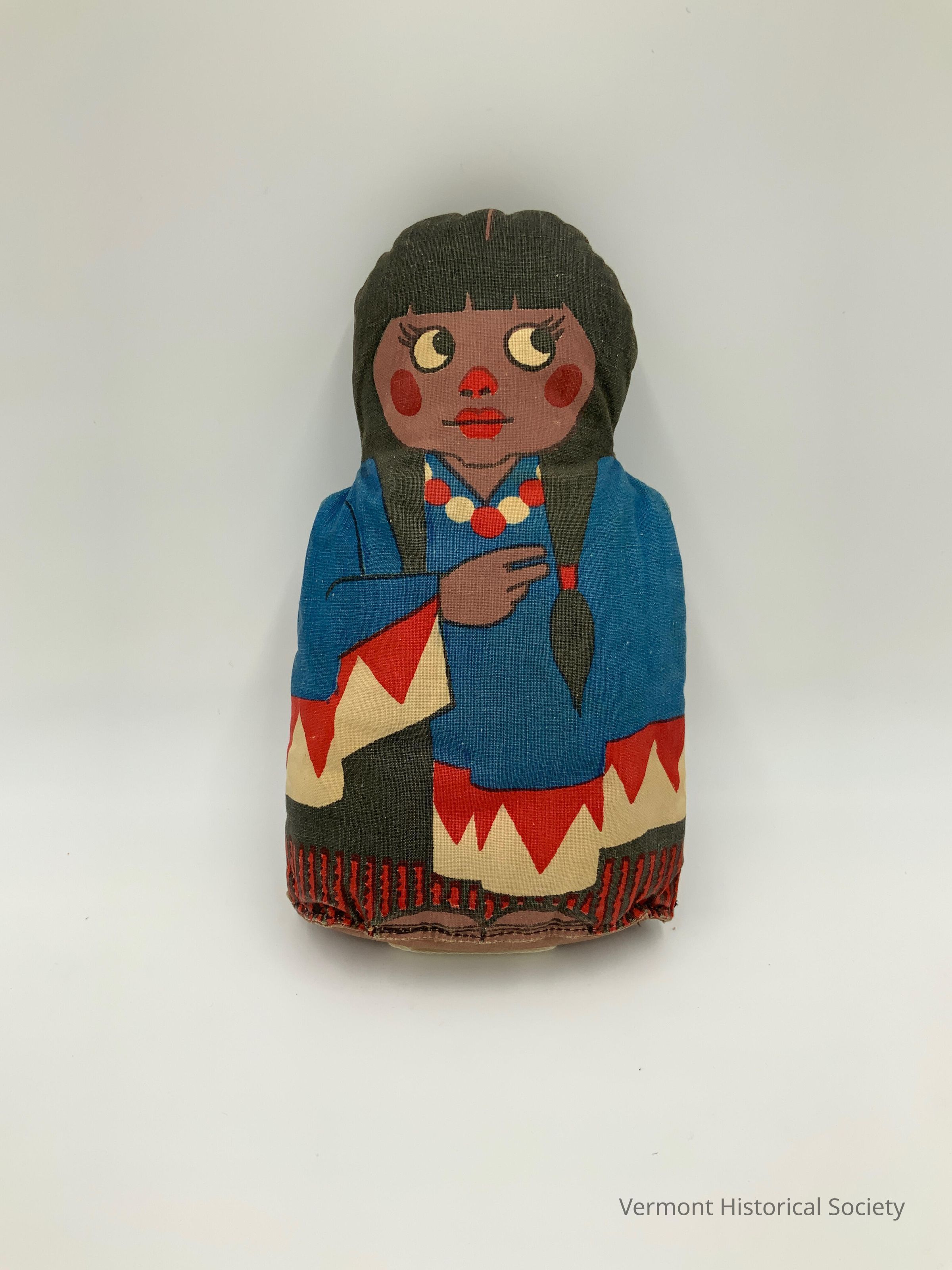Molly, and her husband Joe, were St. Francis Abenaki people whose figures became central to Vermont culture after Joe's actions during the Revolutionary War were publicized and, later, romanticized. The pattern for these dolls was widely printed and sold throughout Vermont as tourist souvenirs. These particular dolls were constructed by Katherine Dopp from a kit she purchased at a gift store at Joe's Pond in the 1950s.Acquisition