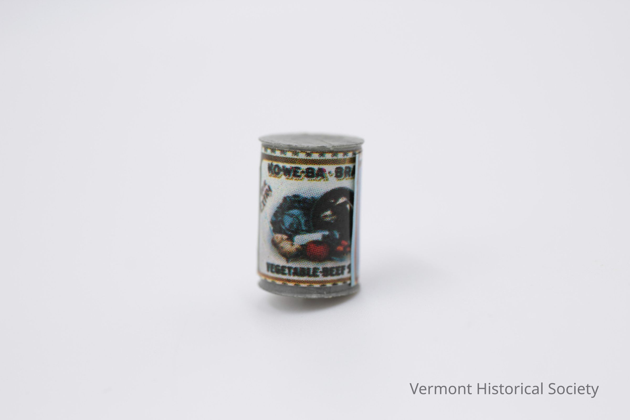 Miniature cylindrical food-storage can. The can is made of silver-colored plastic and is wrapped with a printed paper label. One side of the paper label shows an assortment of vegetables with the words, "KO-WE-BA VEGETABLE BEEF". The other side shows a butterfly.Context