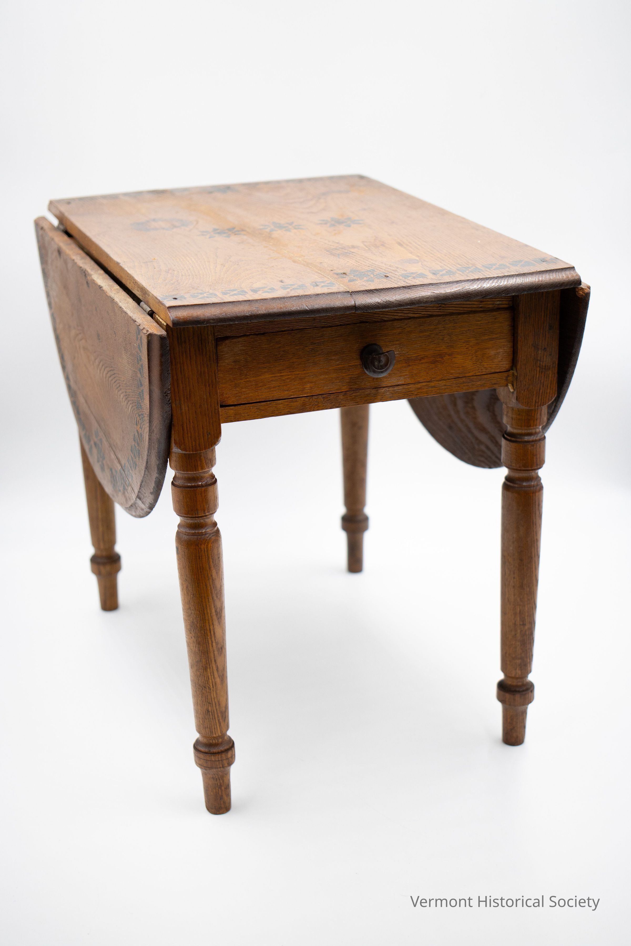 Paint-decorated, drop leaf, oak, child's table. Top edge of the table has black stencil or stamp decorative border with three starbursts in center and one at center of each edge with black geometric squares in between. Includes single center drawer with turned wooden knob. Drawer has nail construction. Table rests on four ring-turned legs