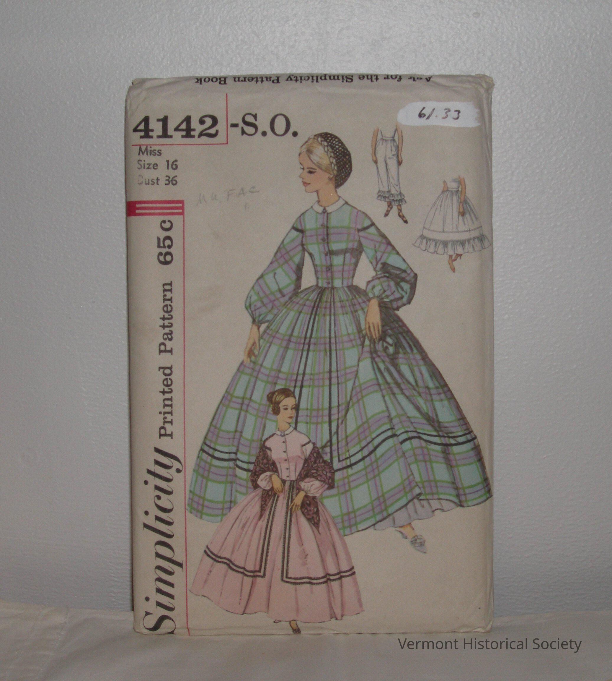 Uncut sewing pattern. The envelope shows an illustration of a woman in a voluminous 1860s-style blue-and-purple plaid dress. At her feet is a small illustration of another woman in the same dress, but in pink. In the upper right are illustrations of bloomers and a petticoat. The left side is labeled, "Simplicity Printed Pattern 65c". Contained inside are two pages of instructions and multiple large sheets of tissue with the printed pattern pieces.