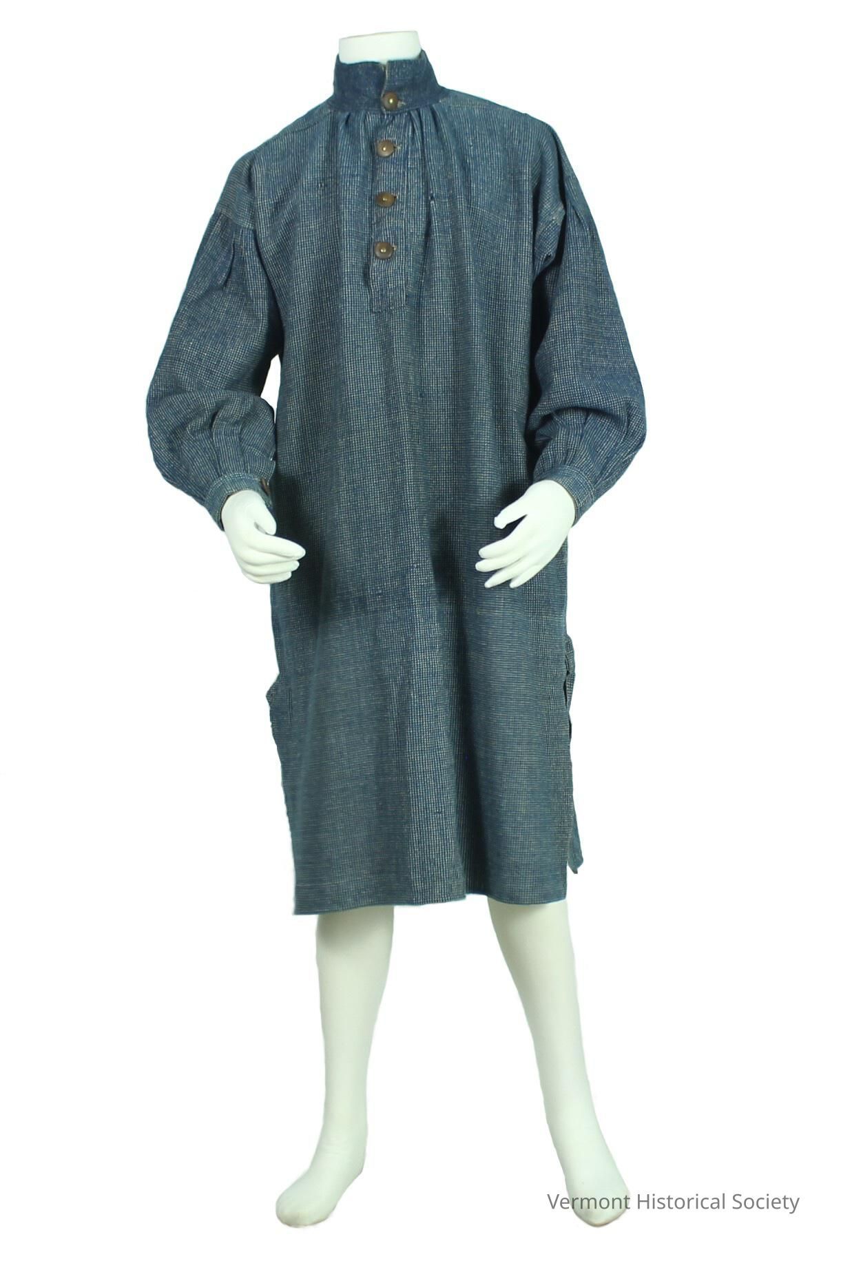 Long woolen work shirt. The fabric is thick wool held in a twill weave, with alternating blue and white warps. The Henley neckline secures with four buttons, the top one being in the collar. The short collar stand up when fully buttoned. The long sleeves are set low on the shoulder and are made loose, but secure around the wrist with buttons. The hemline is split on either side, and the joins reinforced with an extra triangle of fabric. The buttons are made of turned wood with a brass center, save for one silver-toned buttons on the wrist.Context