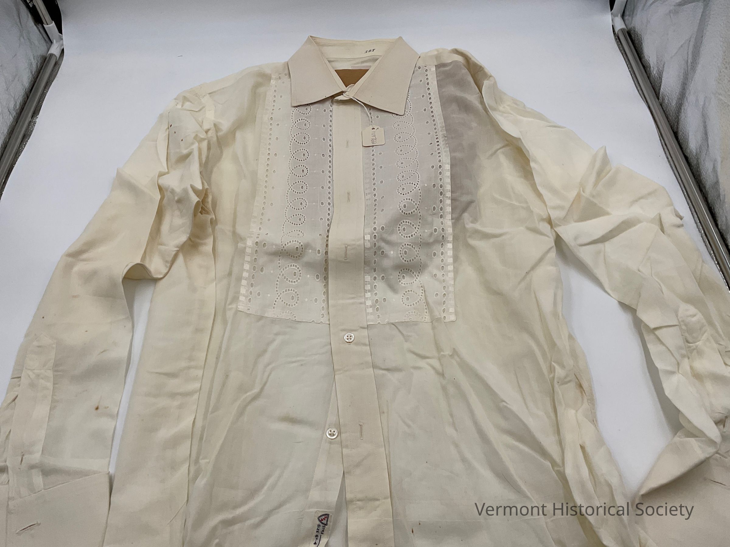 Formal white man's shirt with 2 decorative eyelet panels as the yoke. The shirt buttons up the center front, has long sleeves, and has a pointed collar.