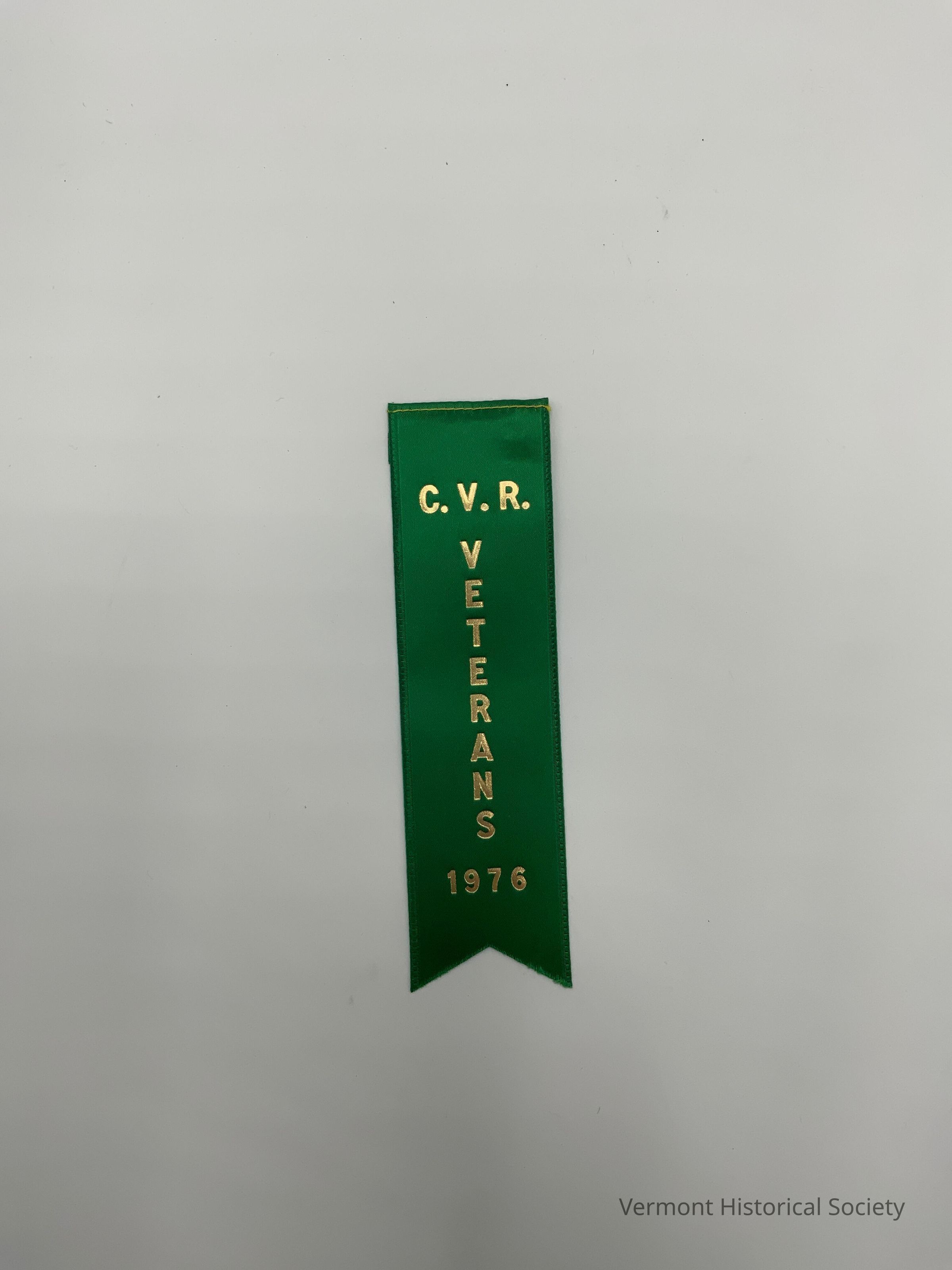 Green satin-woven ribbon with the stamped inscription, "C. V. R. VETERANS 1976". The bottom is cut into two points, and there is a safety pin attached to the top back.