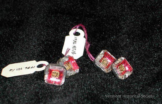 Set of cuff links. Each is set with 2 cut glass gems set in a foiled bezel. The foil is pink and gold.