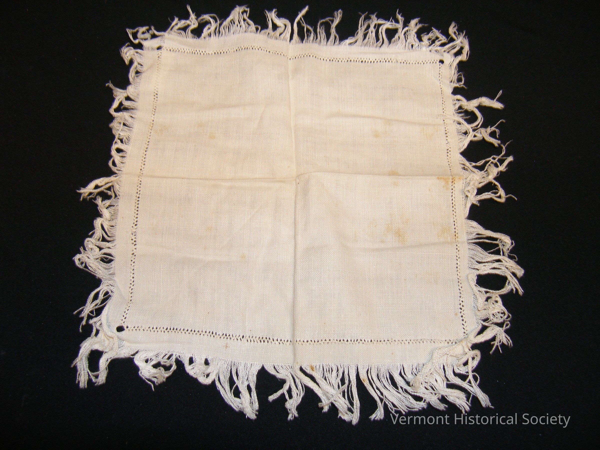 Handwoven linen napkin with fringe and drawn work border.