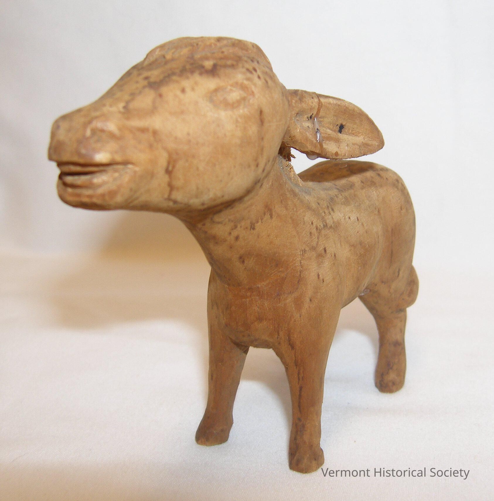 Small wooden carving of a braying donkey. It is shown standing on all four feet with its ears back and mouth slightly open.