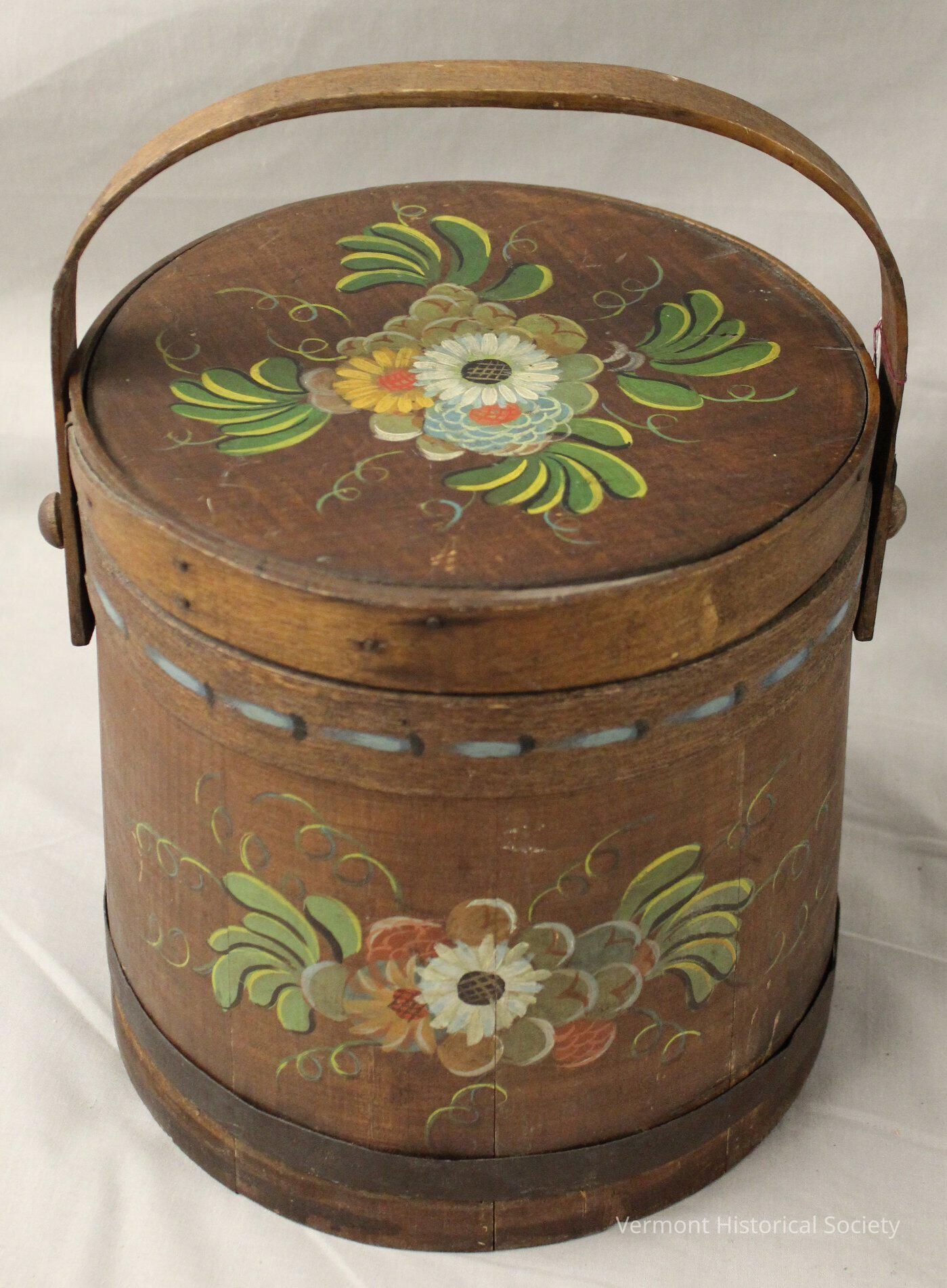Decorated wooden firkin (a) and cover (b). There is a wooden band around the top section of the firkin with a handle attached, and a metal band around the lower section. The firkin is stained dark brown and has a hand painted design of flowers, leaves, and scrolls on both the firkin and the lid. The leaves and scrolls are yellow and green, and the flowers are blue, yellow, and white. There is a blue stitch-like design painted around the wooden band that encircles the top of the firkin. On the bottom is written "$ 8.50" in white pencil.Context