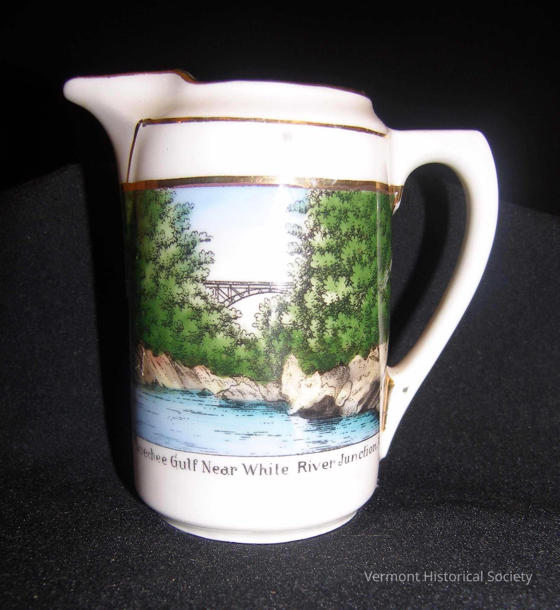 White ceramic cream pitcher printed on one side with a full-color illustration of a metal bridge high over a river. The image is labeled, "Quechee Gulf Near White River Junction, Vt." The bottom is marked, "Made in Germany for N. C. Powers White River Junction Vermont".