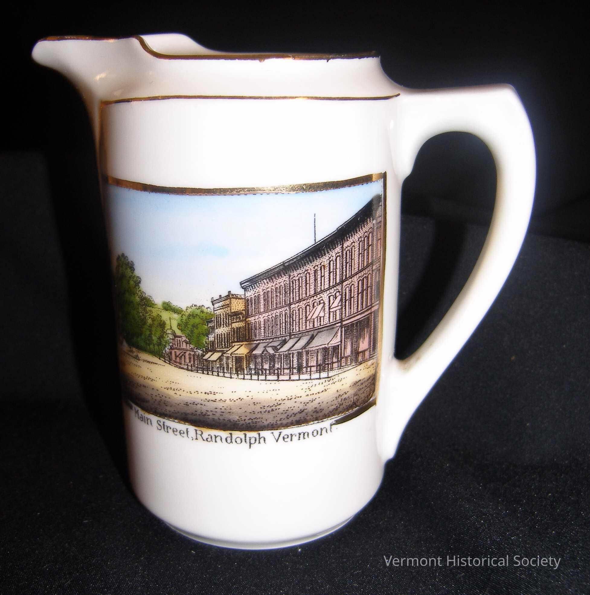 White ceramic cream pitcher printed on one side with a full-color illustration of a city street lined with commercial buildings. The image is labeled, "Main Street, Randolph, Vermont." The bottom is marked, "MADE IN GERMANY FOR W. E. LAMSON & SON CO. RANDOLPH, VERMONT".
